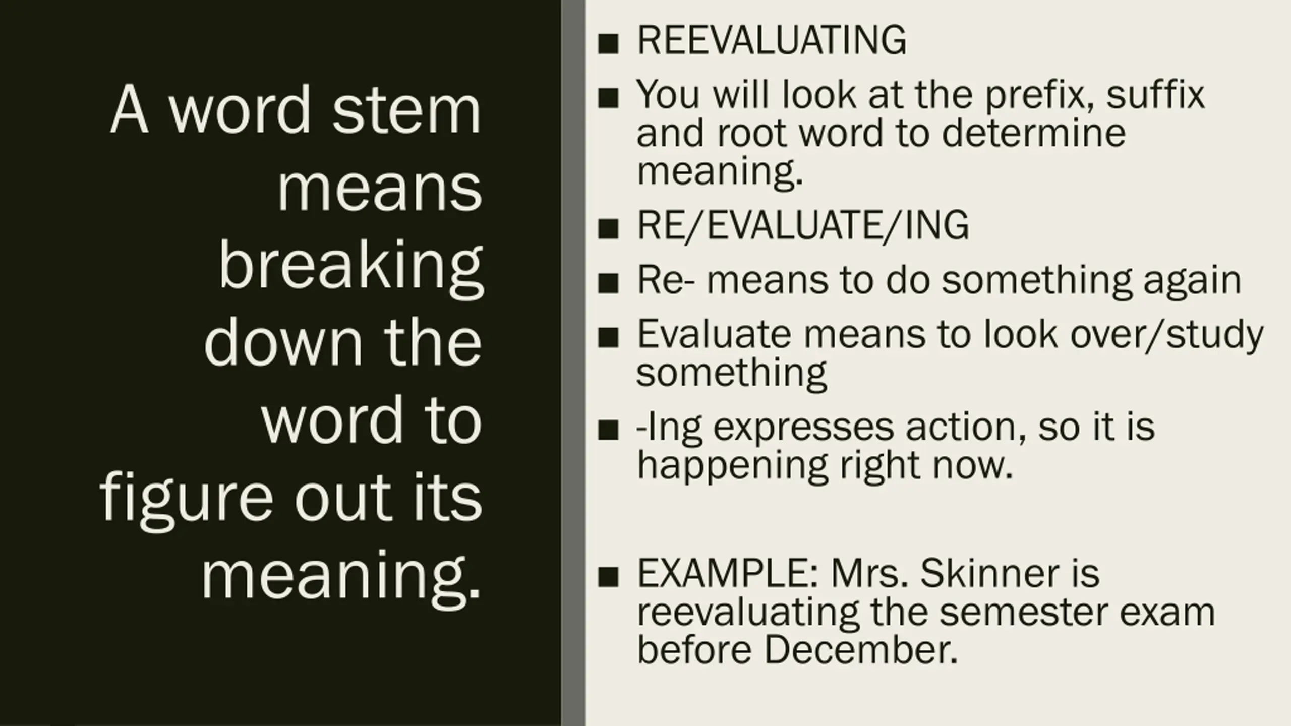 REEVALUATING You will look at the prefix, suffix and root word to determine meaning. RE/EVALUATE/ING Re- means to do something again Evaluate means to look over/study something -Ing expresses action, so it is happening right now. A word stem means breaking down the word to figure out its meaning. EXAMPLE: Mrs. Skinner is reevaluating the semester exam before December.