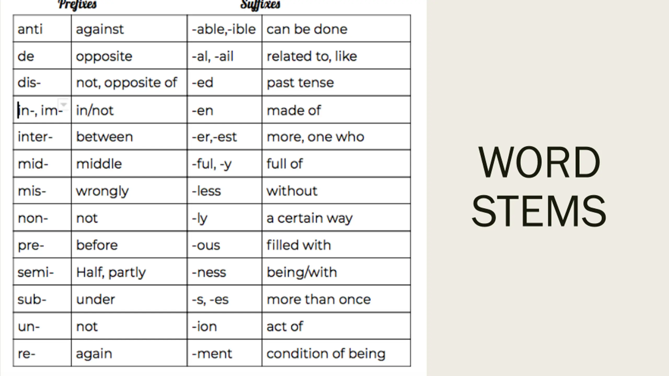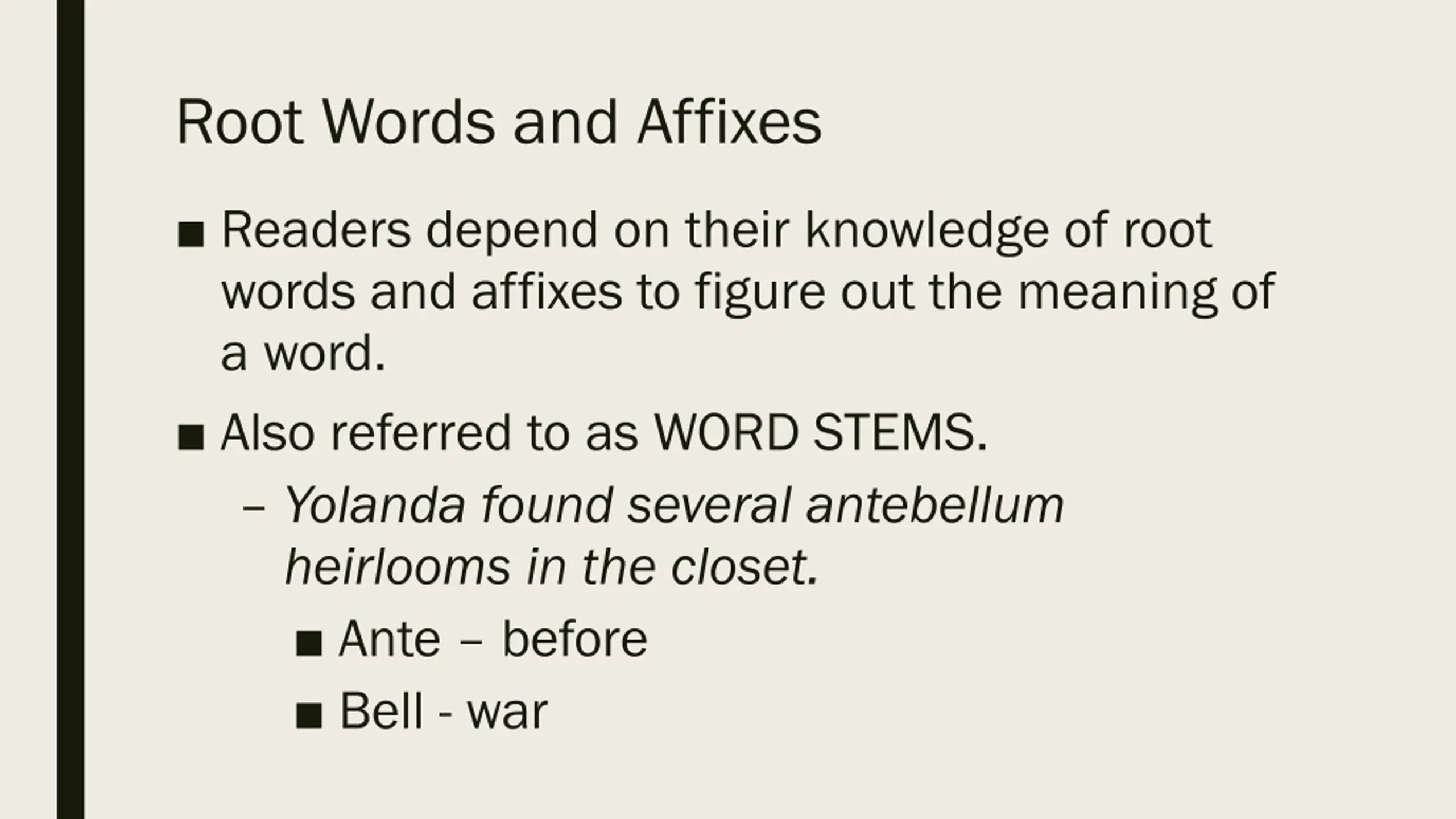 Root Words and Affixes Readers depend on their knowledge of root words and affixes to figure out the meaning of a word. Also referred to as WORD STEMS. Yolanda found several antebellum heirlooms in the closet. Ante before Bell - war