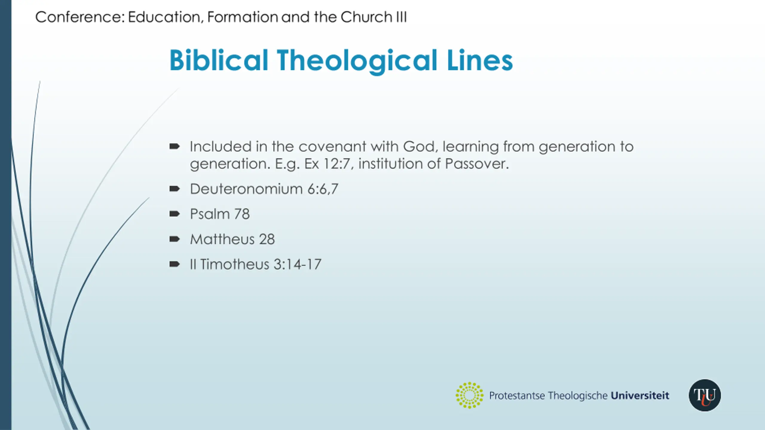 - Biblical Theological Lines Included in the covenant with God, learning from generation to generation. E.g. Ex 12:7, institution of Passover. Deuteronomium 6:6,7 Psalm 78 Mattheus 28 II Timotheus 3:14-17
