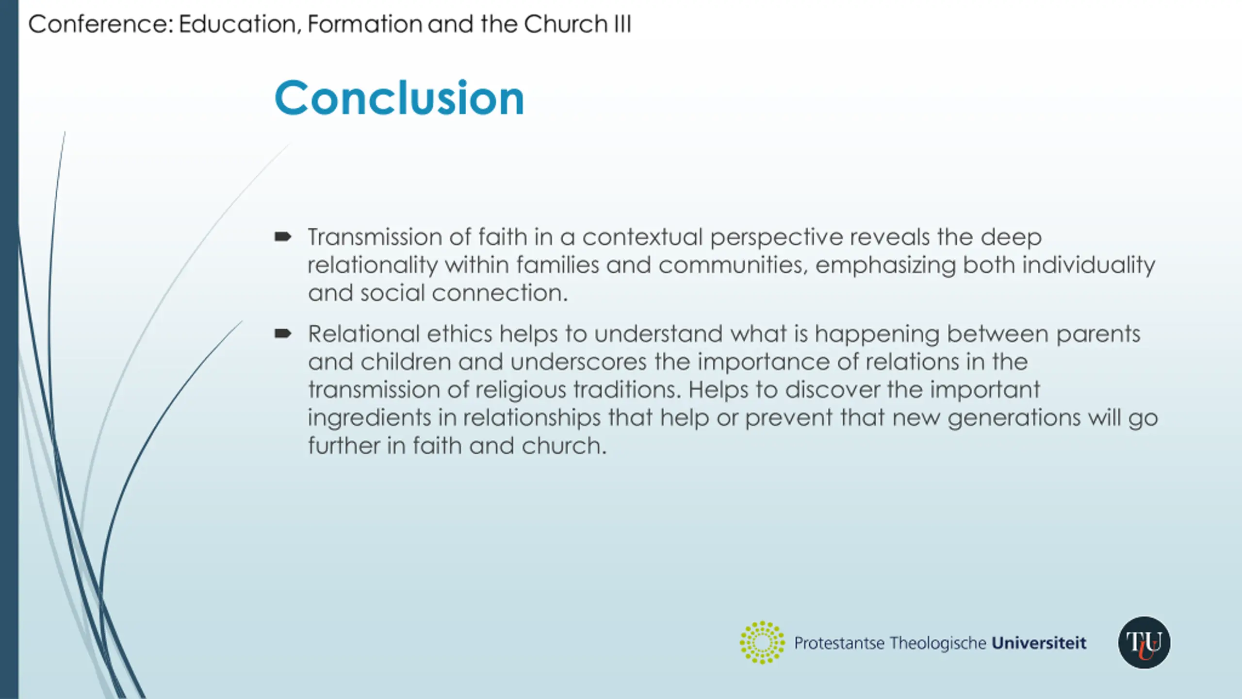 - Conclusion Transmission of faith in a contextual perspective reveals the deep relationality within families and communities, emphasizing both individuality and social connection. Relational ethics helps to understand what is happening between parents and children and underscores the importance of relations in the transmission of religious traditions. Helps to discover the important ingredients in relationships that help or prevent that new generations will go further in faith and church.