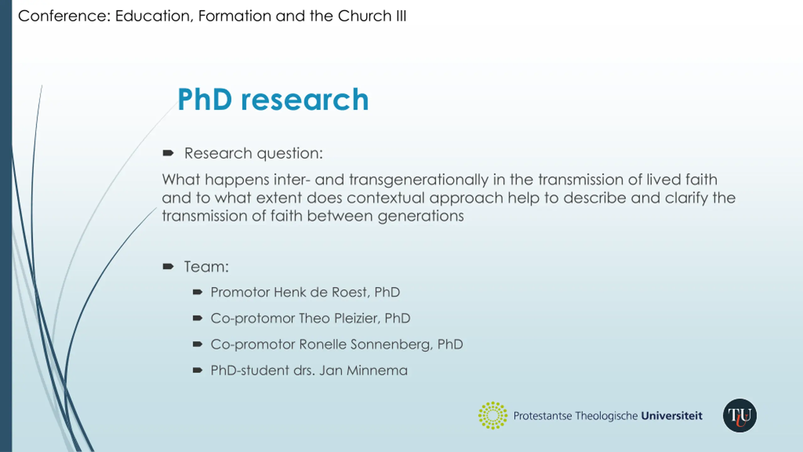 - Conference: Education, Formation and the Church III PhD research Research question: What happens inter- and transgenerationally in the transmission of lived faith and to what extent does contextual approach help to describe and clarify the transmission of faith between generations Team: Promotor Henk de Roest, PhD Co-protomor Theo Pleizier, PhD Co-promotor Ronelle Sonnenberg, PhD PhD-student drs. Jan Minnema