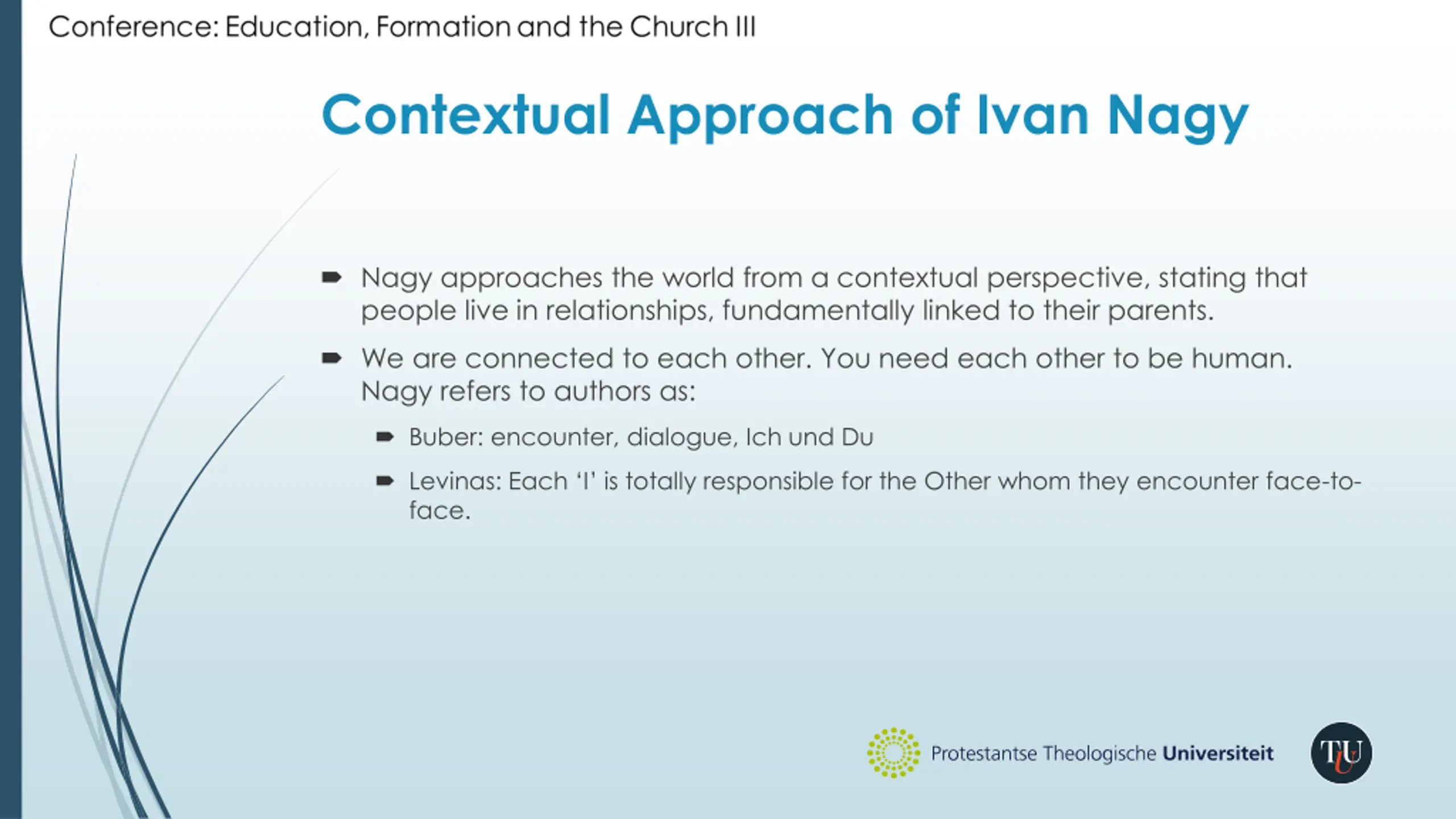 - Contextual Approach of Ivan Nagy Nagy approaches the world from a contextual perspective, stating that people live in relationships, fundamentally linked to their parents. We are connected to each other. You need each other to be human. Nagy refers to authors as: Buber: encounter, dialogue, Ich und Du Levinas: Each I is totally responsible for the Other whom they encounter face-to- face.