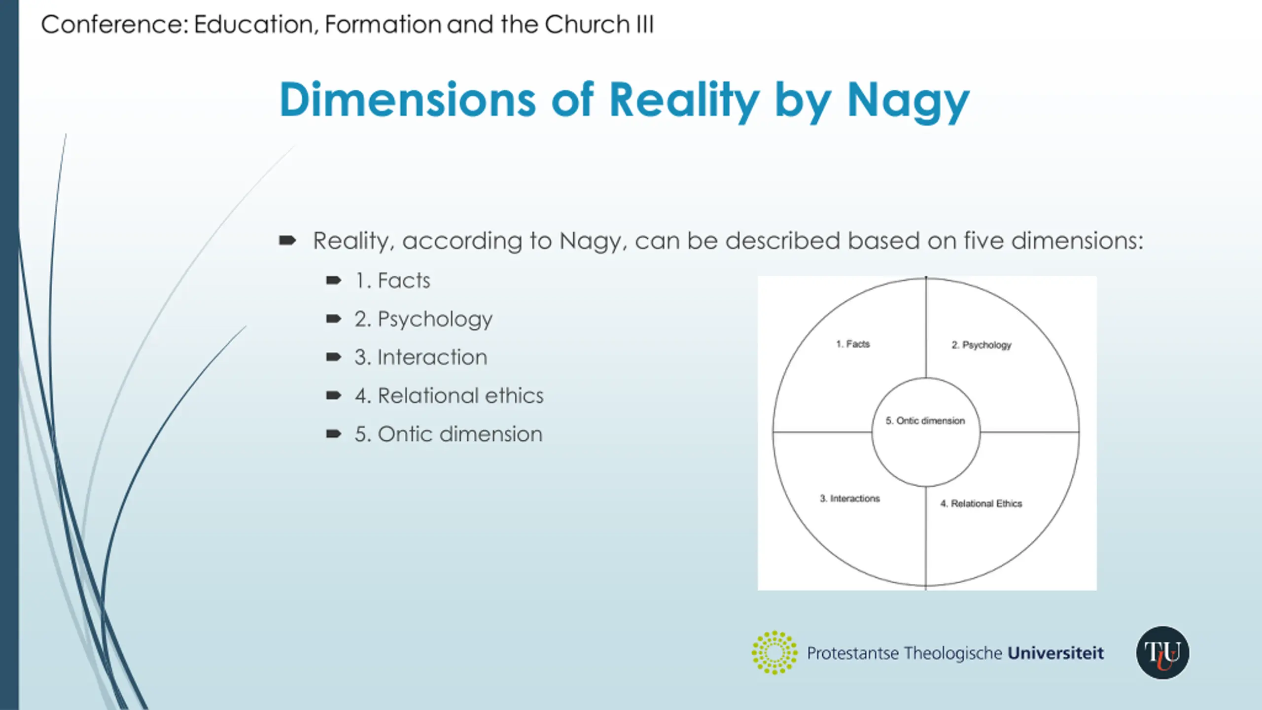 - Dimensions of Reality by Nagy Reality, according to Nagy, can be described based on five dimensions: 1. Facts 2. Psychology 3. Interaction 4. Relational ethics 5. Ontic dimension
