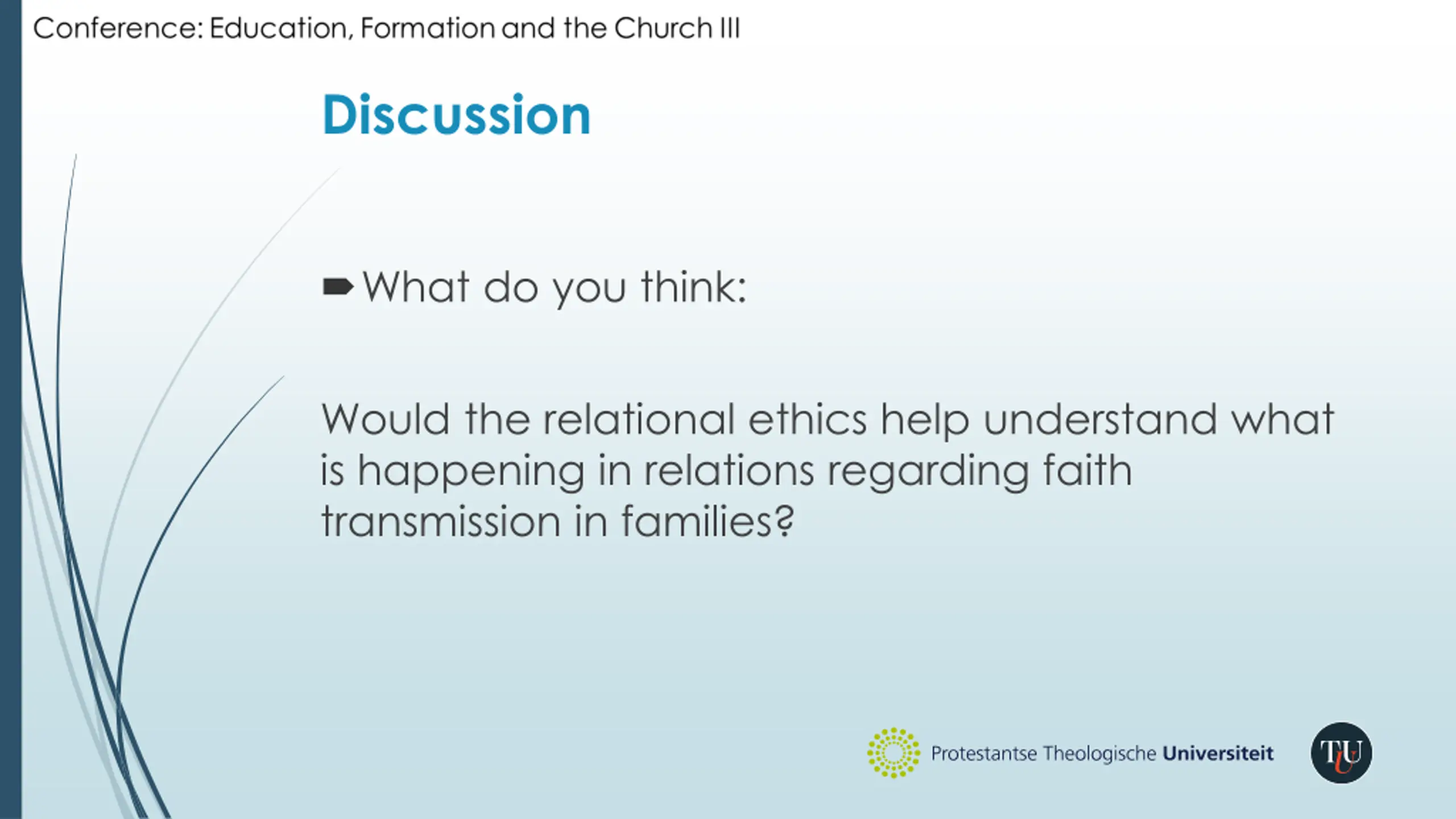 - Discussion What do you think: Would the relational ethics help understand what is happening in relations regarding faith transmission in families?