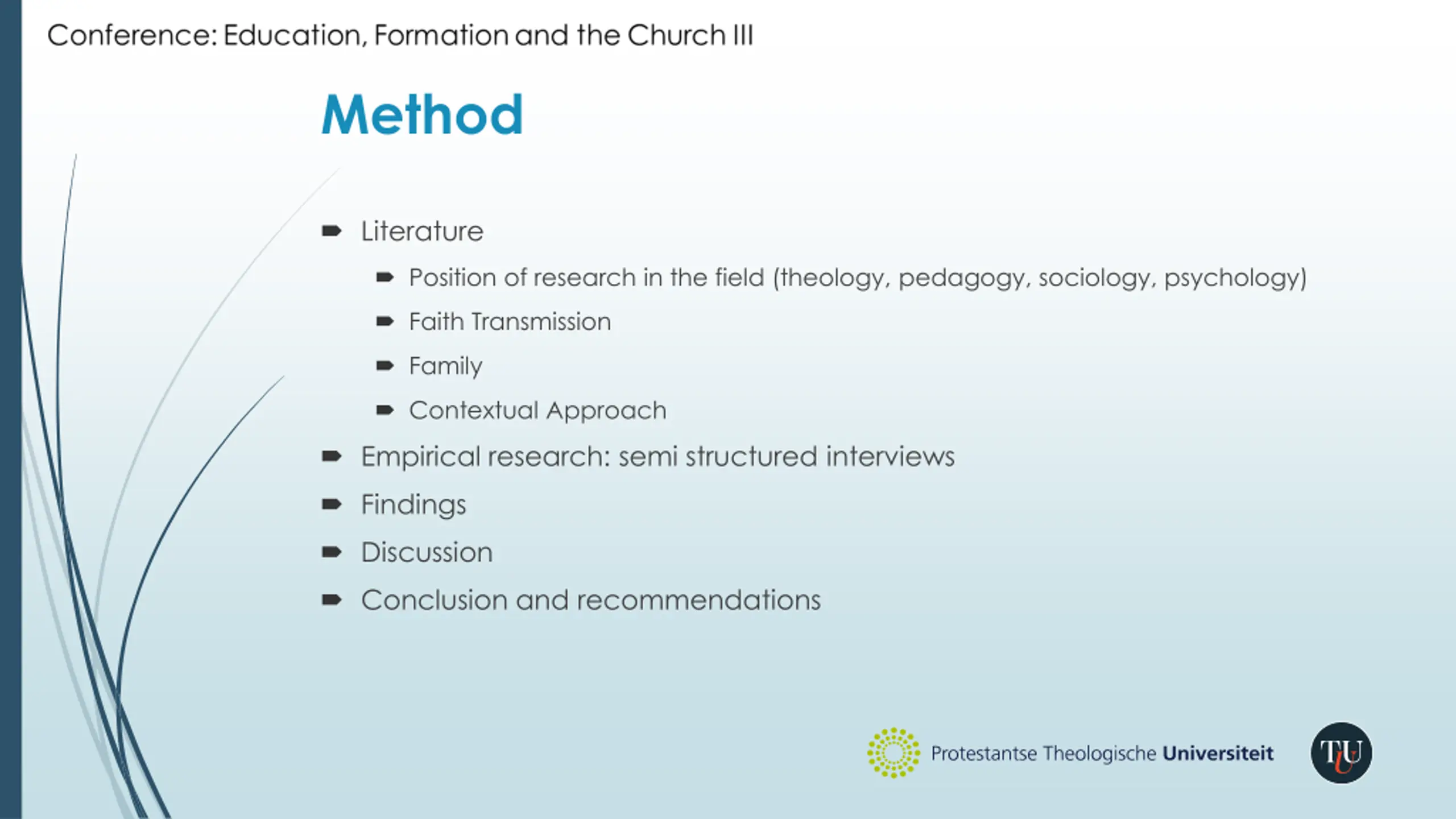 - Method Literature Position of research in the field (theology, pedagogy, sociology, psychology) Faith Transmission Family Contextual Approach Empirical research: semi structured interviews Findings Discussion Conclusion and recommendations