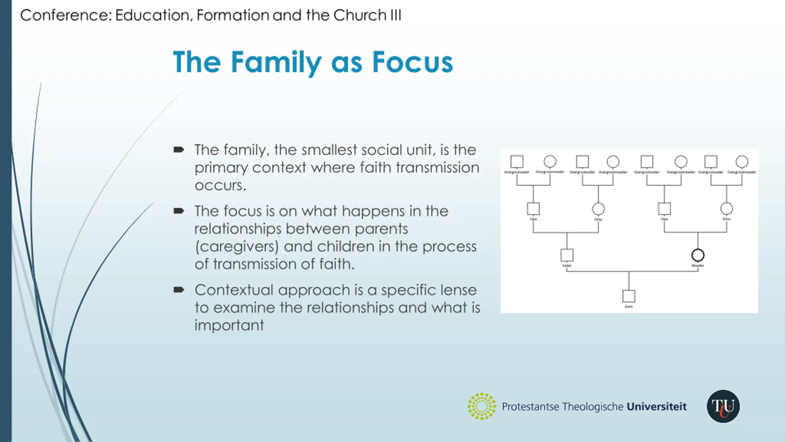 - The Family as Focus The family, the smallest social unit, is the primary context where faith transmission occurs. The focus is on what happens in the relationships between parents (caregivers) and children in the process of transmission of faith. Contextual approach is a specific lense to examine the relationships and what is important