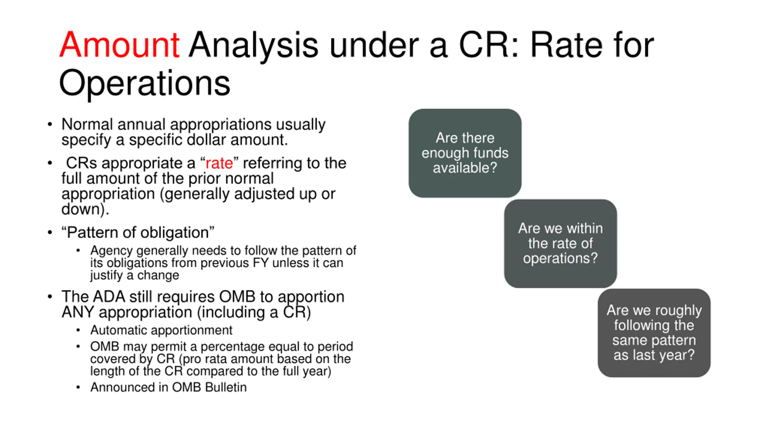 Amount Analysis under a CR: Rate for Operations Normal annual appropriations usually specify a specific dollar amount. CRs appropriate a rate referring to the full amount of the prior normal appropriation (generally adjusted up or down). Pattern of obligation Agency generally needs to follow the pattern of its obligations from previous FY unless it can justify a change The ADA still requires OMB to apportion ANY appropriation (including a CR) Automatic apportionment OMB may permit a percentage equal to period covered by CR (pro rata amount based on the length of the CR compared to the full year) Announced in OMB Bulletin Are there enough funds available? Are we within the rate of operations? Are we roughly following the same pattern as last year?
