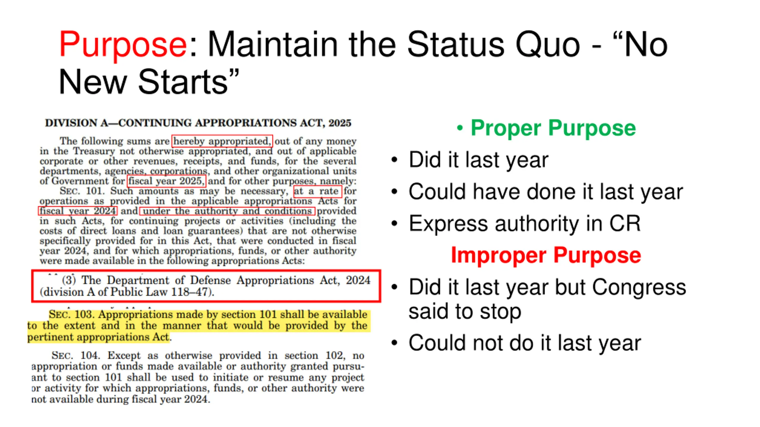 Purpose: Maintain the Status Quo - No New Starts Proper Purpose Did it last year Could have done it last year Express authority in CR Improper Purpose Did it last year but Congress said to stop Could not do it last year