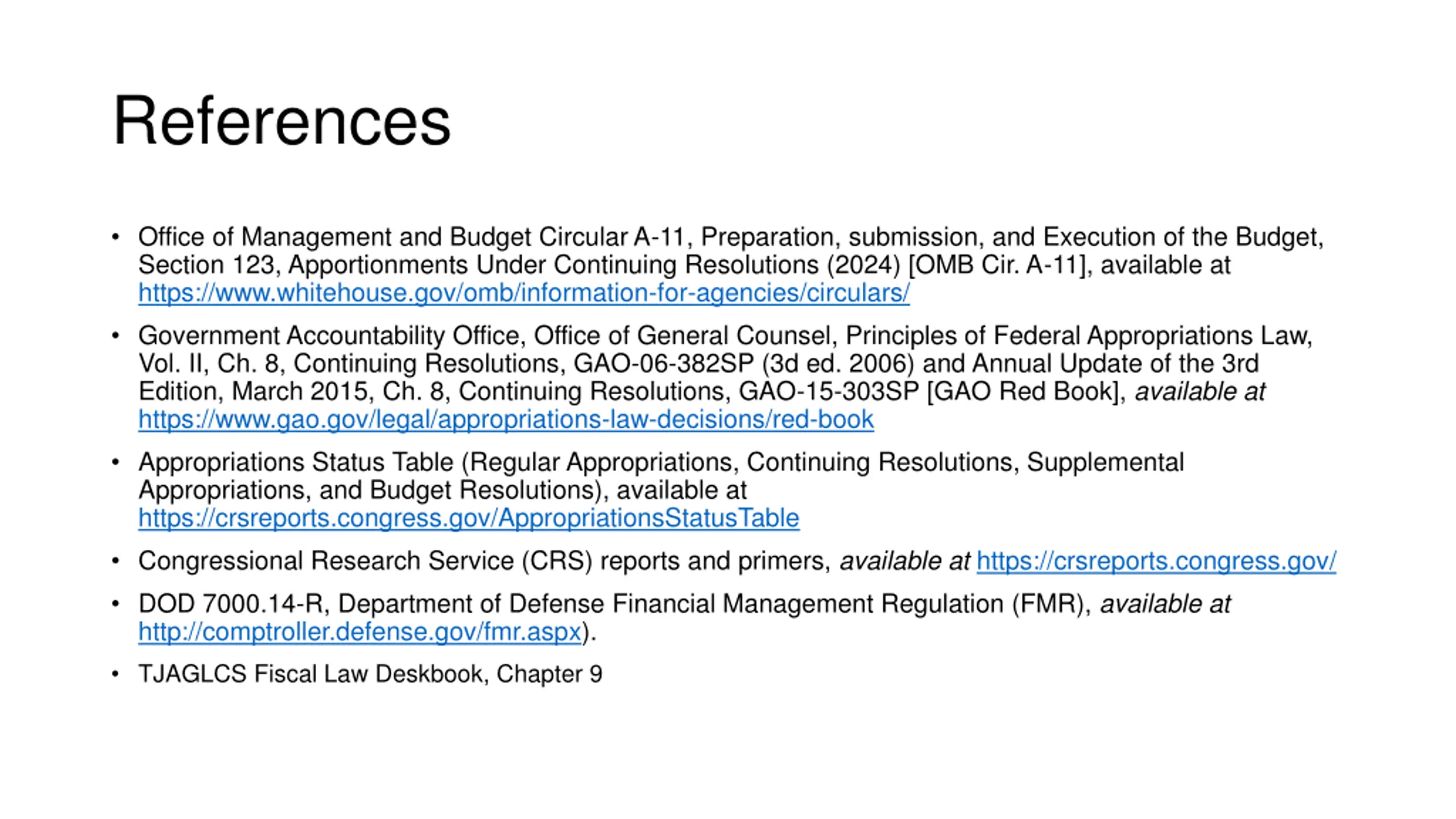 References Office of Management and Budget Circular A-11, Preparation, submission, and Execution of the Budget, Section 123, Apportionments Under Continuing Resolutions (2024) [OMB Cir. A-11], available at https://www.whitehouse.gov/omb/information-for-agencies/circulars/ Government Accountability Office, Office of General Counsel, Principles of Federal Appropriations Law, Vol. II, Ch. 8, Continuing Resolutions, GAO-06-382SP (3d ed. 2006) and Annual Update of the 3rd Edition, March 2015, Ch. 8, Continuing Resolutions, GAO-15-303SP [GAO Red Book], available at https://www.gao.gov/legal/appropriations-law-decisions/red-book Appropriations Status Table (Regular Appropriations, Continuing Resolutions, Supplemental Appropriations, and Budget Resolutions), available at https://crsreports.congress.gov/AppropriationsStatusTable Congressional Research Service (CRS) reports and primers, available at https://crsreports.congress.gov/ DOD 7000.14-R, Department of Defense Financial Management Regulation (FMR), available at http://comptroller.defense.gov/fmr.aspx). TJAGLCS Fiscal Law Deskbook, Chapter 9