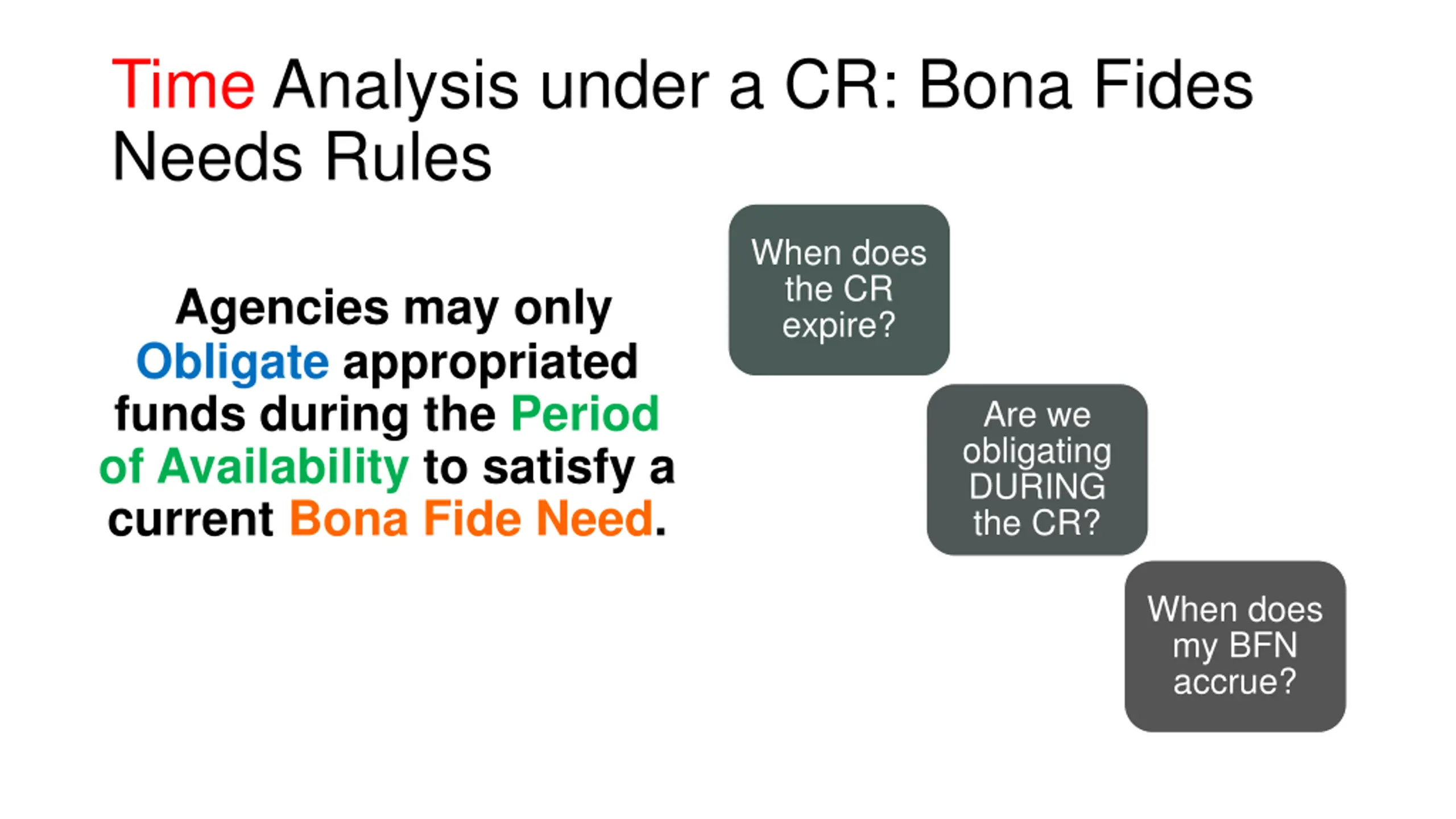 Time Analysis under a CR: Bona Fides Needs Rules When does the CR expire? Agencies may only Obligate appropriated funds during the Period of Availability to satisfy a current Bona Fide Need. Are we obligating DURING the CR? When does my BFN accrue?