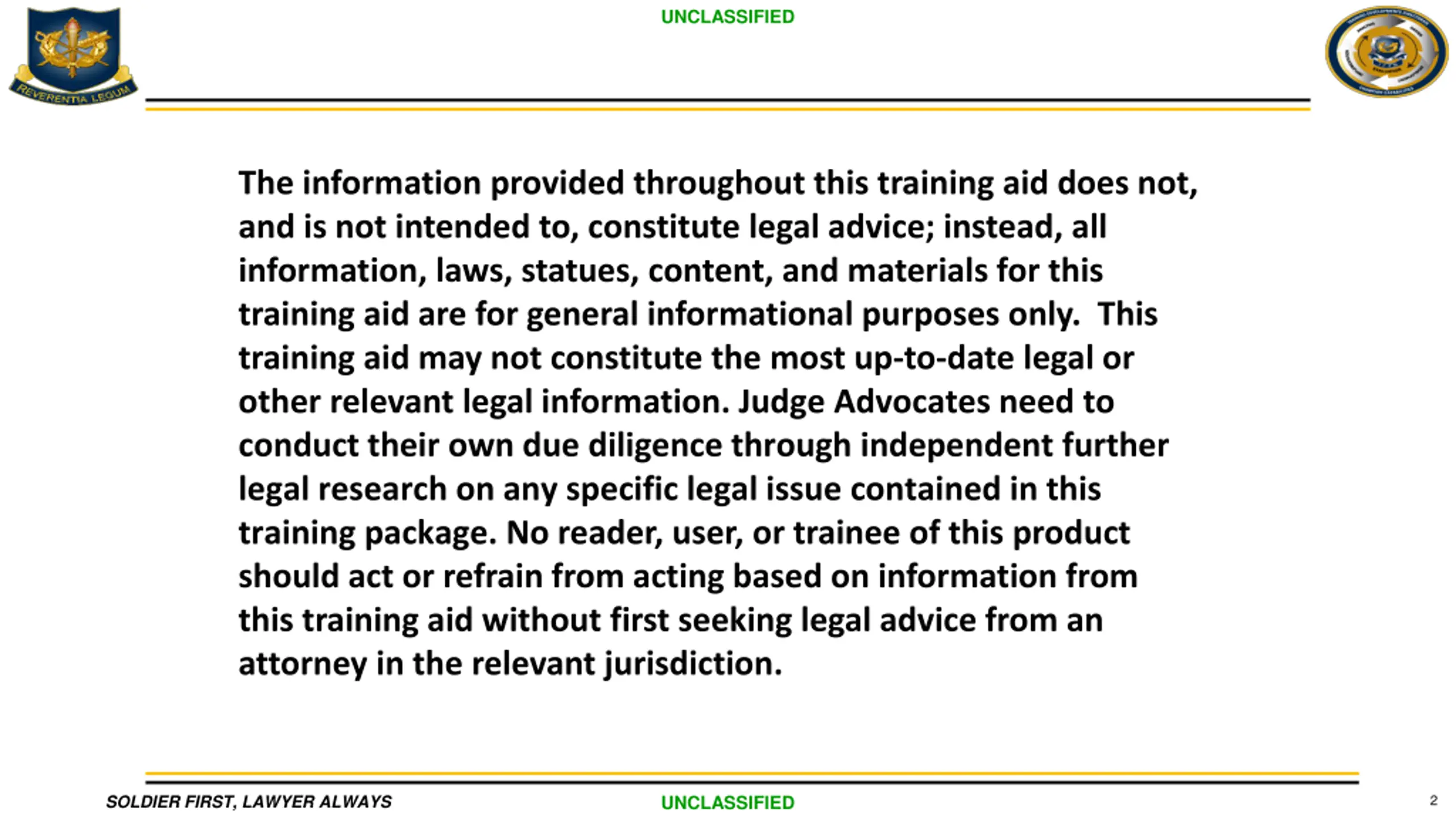 UNCLASSIFIED The information provided throughout this training aid does not, and is not intended to, constitute legal advice; instead, all information, laws, statues, content, and materials for this training aid are for general informational purposes only. This training aid may not constitute the most up-to-date legal or other relevant legal information. Judge Advocates need to conduct their own due diligence through independent further legal research on any specific legal issue contained in this training package. No reader, user, or trainee of this product should act or refrain from acting based on information from this training aid without first seeking legal advice from an attorney in the relevant jurisdiction. SOLDIER FIRST, LAWYER ALWAYS UNCLASSIFIED 2