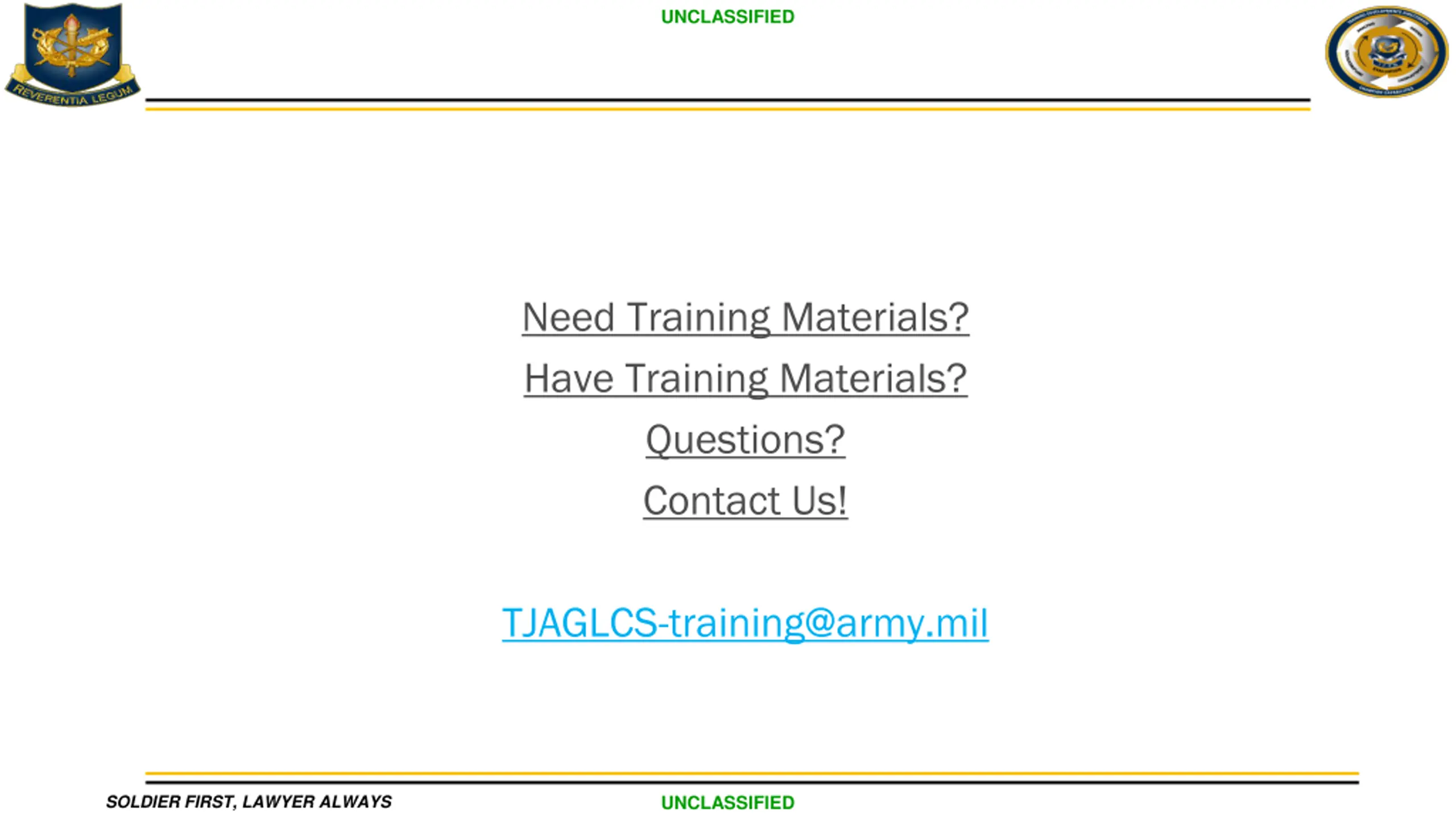 UNCLASSIFIED Need Training Materials? Have Training Materials? Questions? Contact Us! TJAGLCS-training@army.mil SOLDIER FIRST, LAWYER ALWAYS UNCLASSIFIED