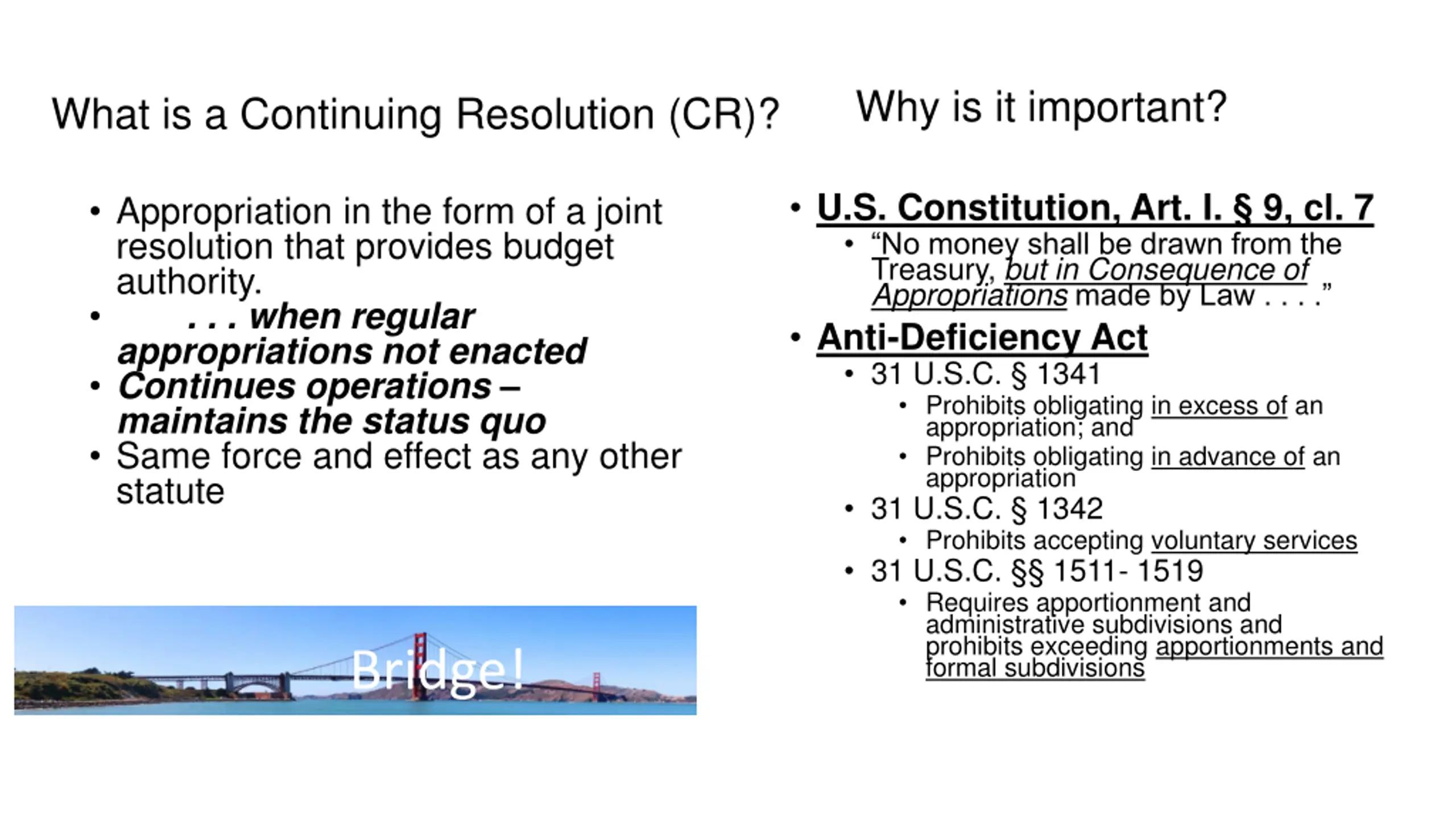 Why is it important? What is a Continuing Resolution (CR)? U.S. Constitution, Art. I. 9, cl. 7 No money shall be drawn from the Treasury, but in Consequence of Appropriations made by Law . . . . Anti-Deficiency Act 31 U.S.C. 1341 Prohibits obligating in excess of an appropriation; and Prohibits obligating in advance of an appropriation 31 U.S.C. 1342 Prohibits accepting voluntary services 31 U.S.C. 1511- 1519 Requires apportionment and administrative subdivisions and prohibits exceeding apportionments and formal subdivisions Appropriation in the form of a joint resolution that provides budget authority. . . . when regular appropriations not enacted Continues operations maintains the status quo Same force and effect as any other statute Bridge!