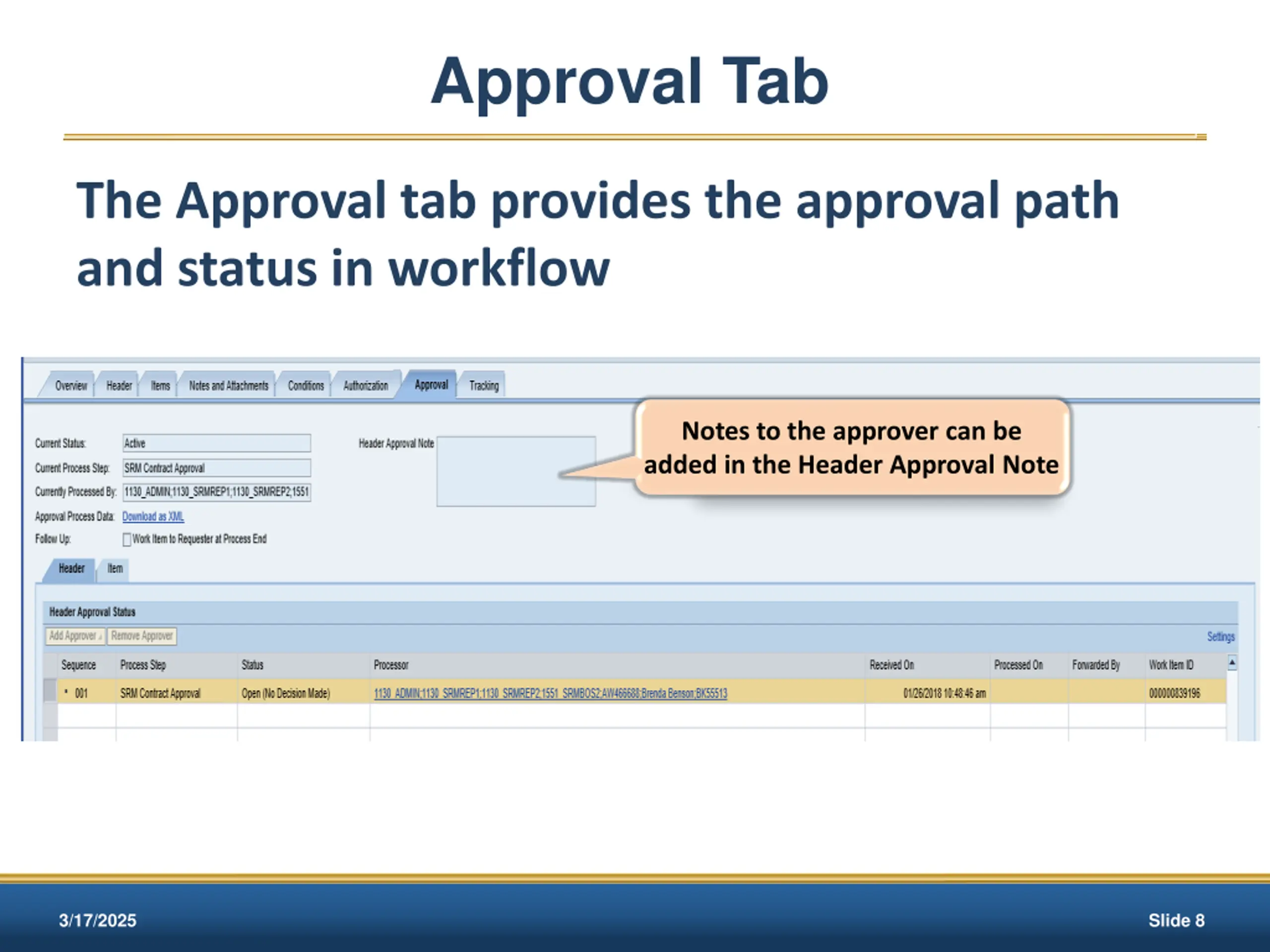 Approval Tab The Approval tab provides the approval path and status in workflow Notes to the approver can be added in the Header Approval Note Slide 8 3/17/2025
