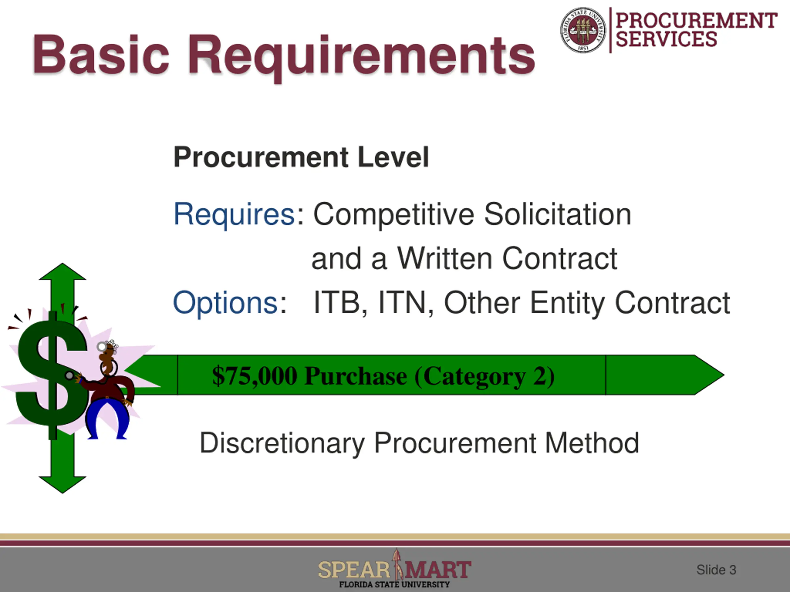 Basic Requirements Procurement Level Requires: Competitive Solicitation and a Written Contract Options: ITB, ITN, Other Entity Contract $75,000 Purchase (Category 2) Discretionary Procurement Method Slide 3