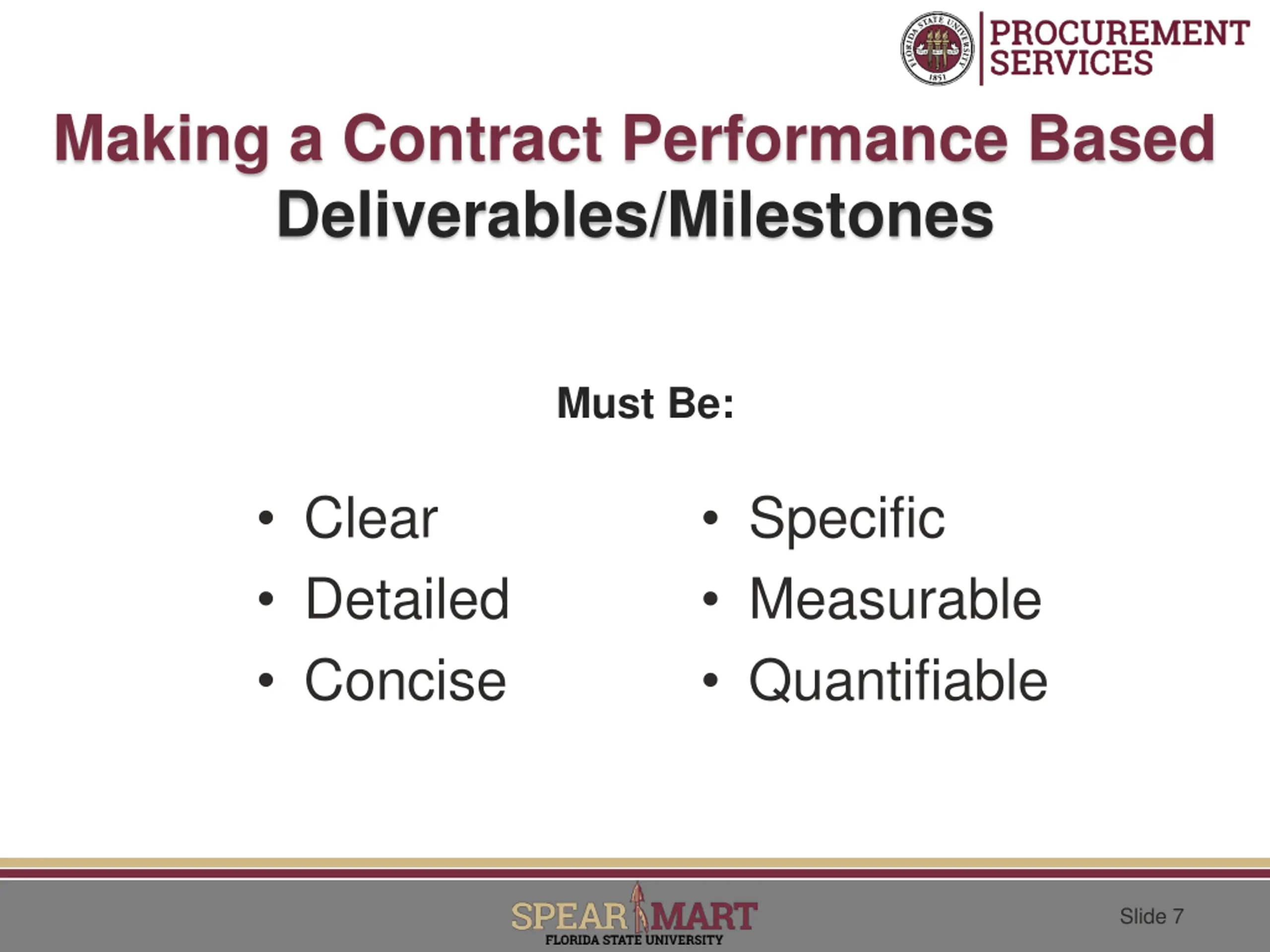 Making a Contract Performance Based Deliverables/Milestones Must Be: Clear Detailed Concise Specific Measurable Quantifiable Slide 7