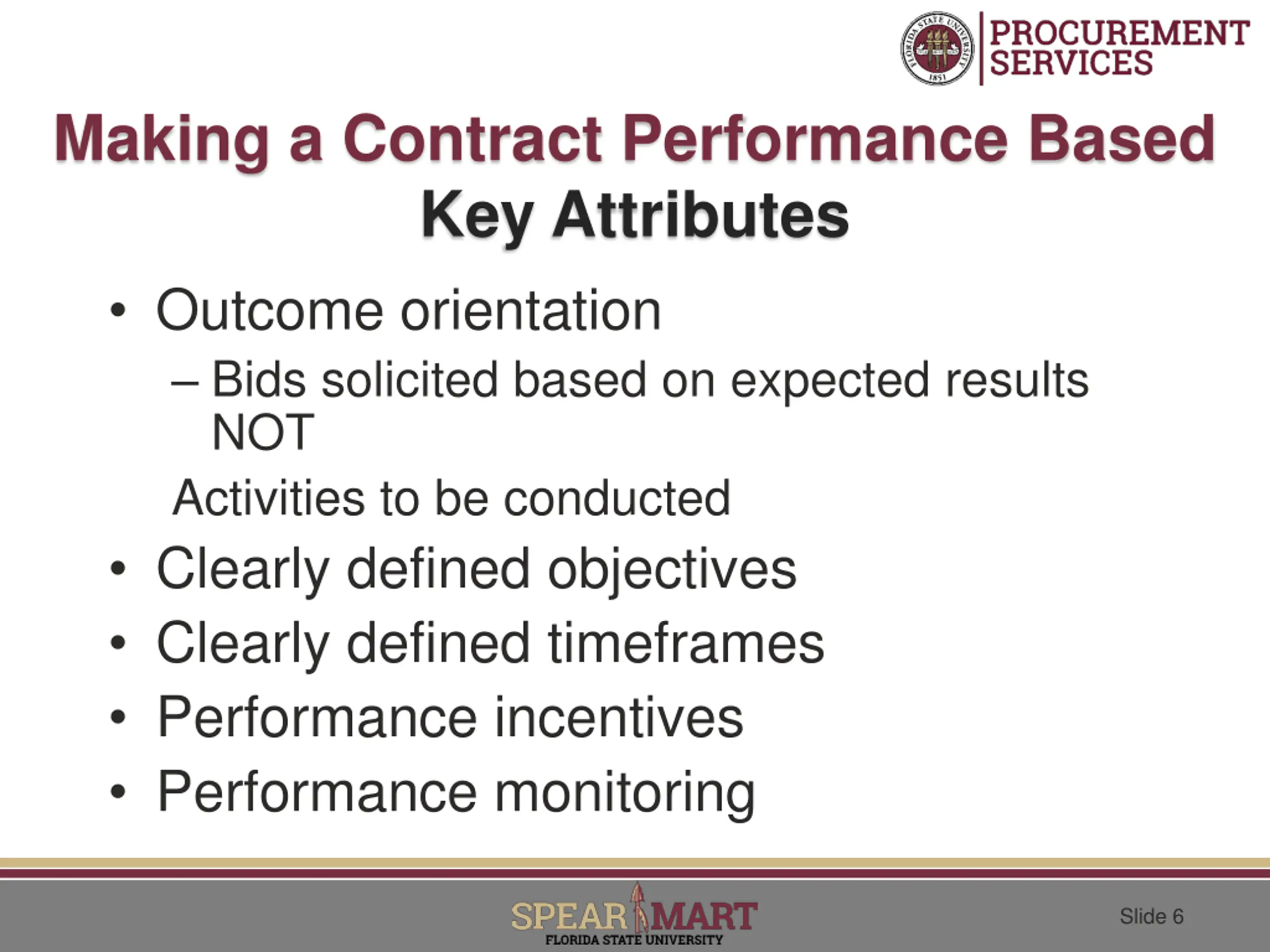 Making a Contract Performance Based Key Attributes Outcome orientation Bids solicited based on expected results NOT Activities to be conducted Clearly defined objectives Clearly defined timeframes Performance incentives Performance monitoring Slide 6
