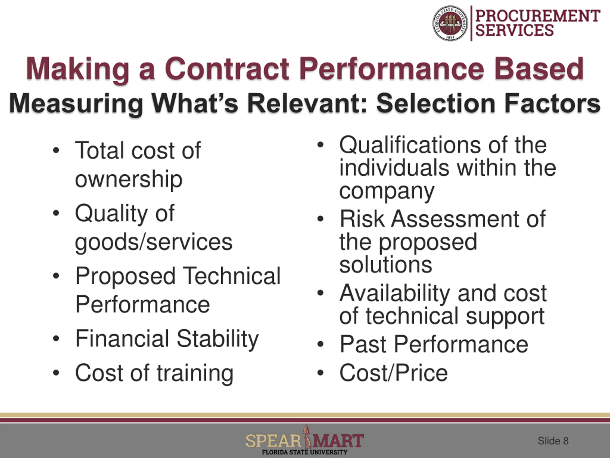 Making a Contract Performance Based Measuring What s Relevant: Selection Factors Qualifications of the individuals within the company Risk Assessment of the proposed solutions Availability and cost of technical support Past Performance Cost/Price Total cost of ownership Quality of goods/services Proposed Technical Performance Financial Stability Cost of training Slide 8