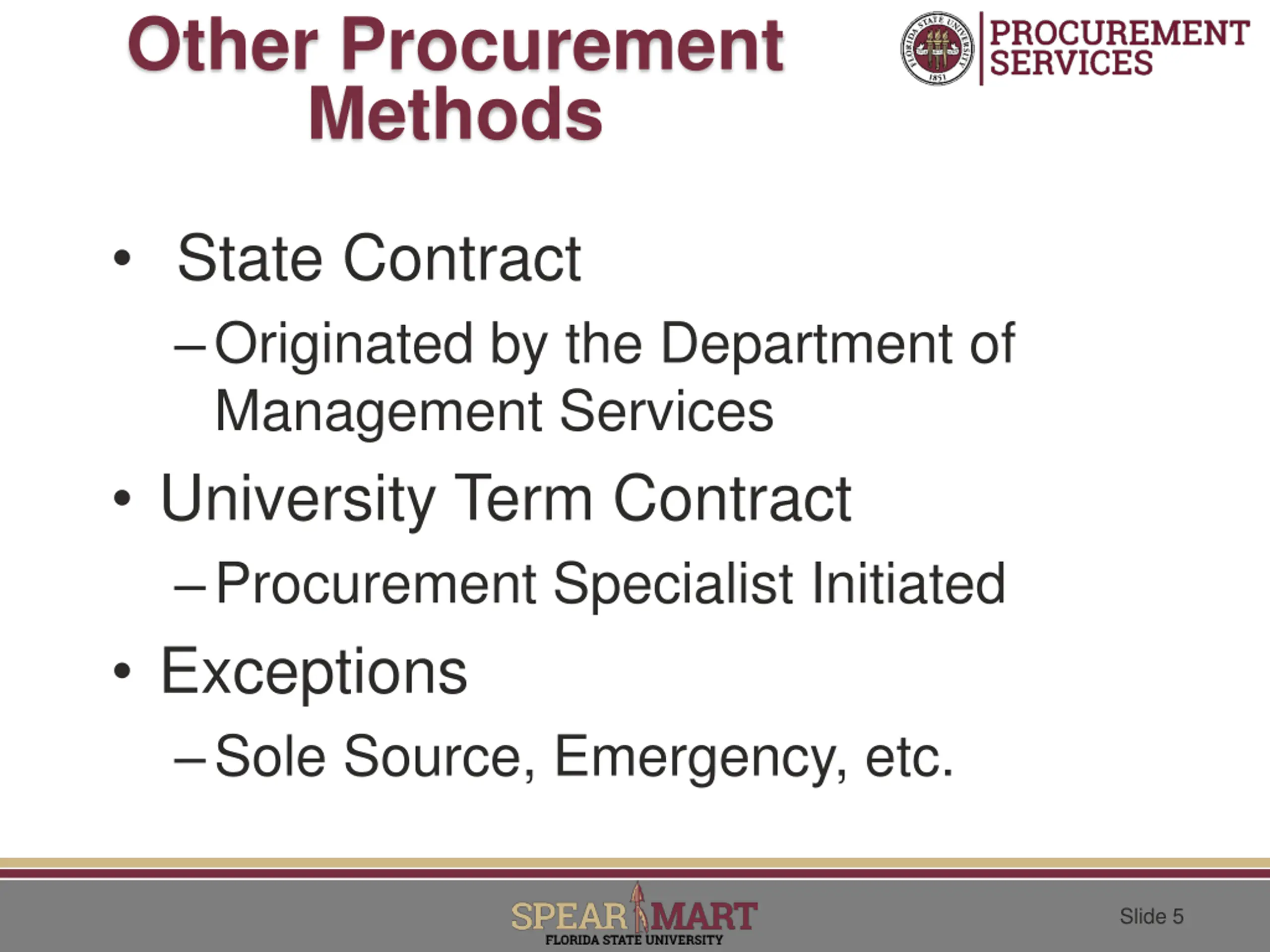 Other Procurement Methods State Contract Originated by the Department of Management Services University Term Contract Procurement Specialist Initiated Exceptions Sole Source, Emergency, etc. Slide 5