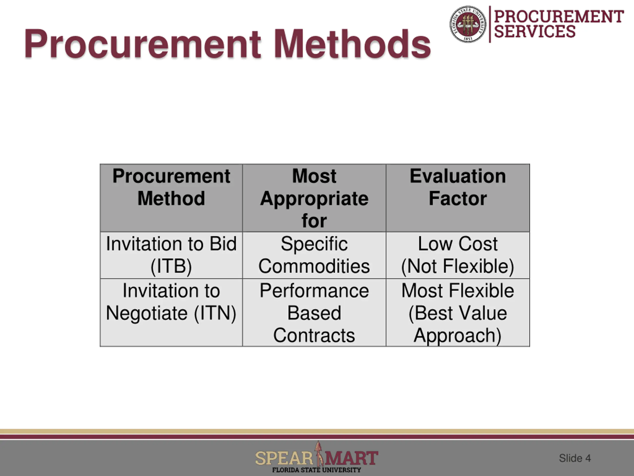 Procurement Methods Procurement Method Most Evaluation Factor Appropriate for Specific Commodities Performance Based Contracts Invitation to Bid (ITB) Invitation to Negotiate (ITN) Low Cost (Not Flexible) Most Flexible (Best Value Approach) Slide 4