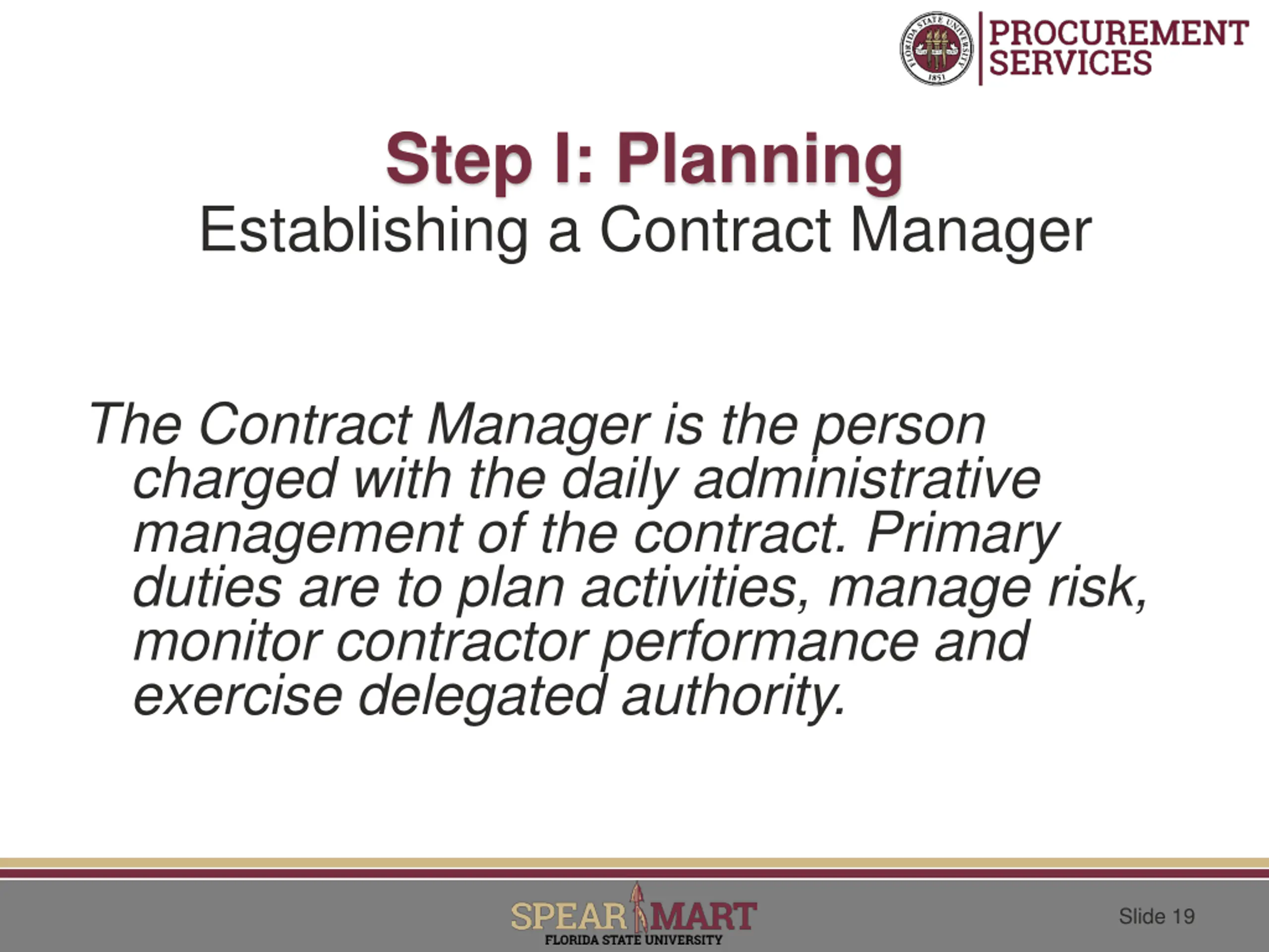 Step I: Planning Establishing a Contract Manager The Contract Manager is the person charged with the daily administrative management of the contract. Primary duties are to plan activities, manage risk, monitor contractor performance and exercise delegated authority. Slide 19
