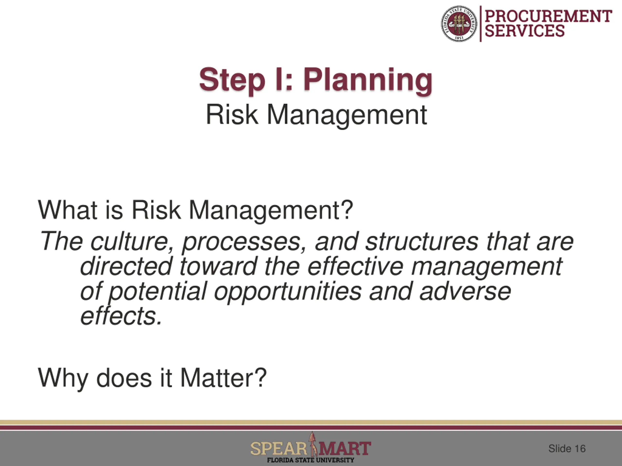 Step I: Planning Risk Management What is Risk Management? The culture, processes, and structures that are directed toward the effective management of potential opportunities and adverse effects. Why does it Matter? Slide 16