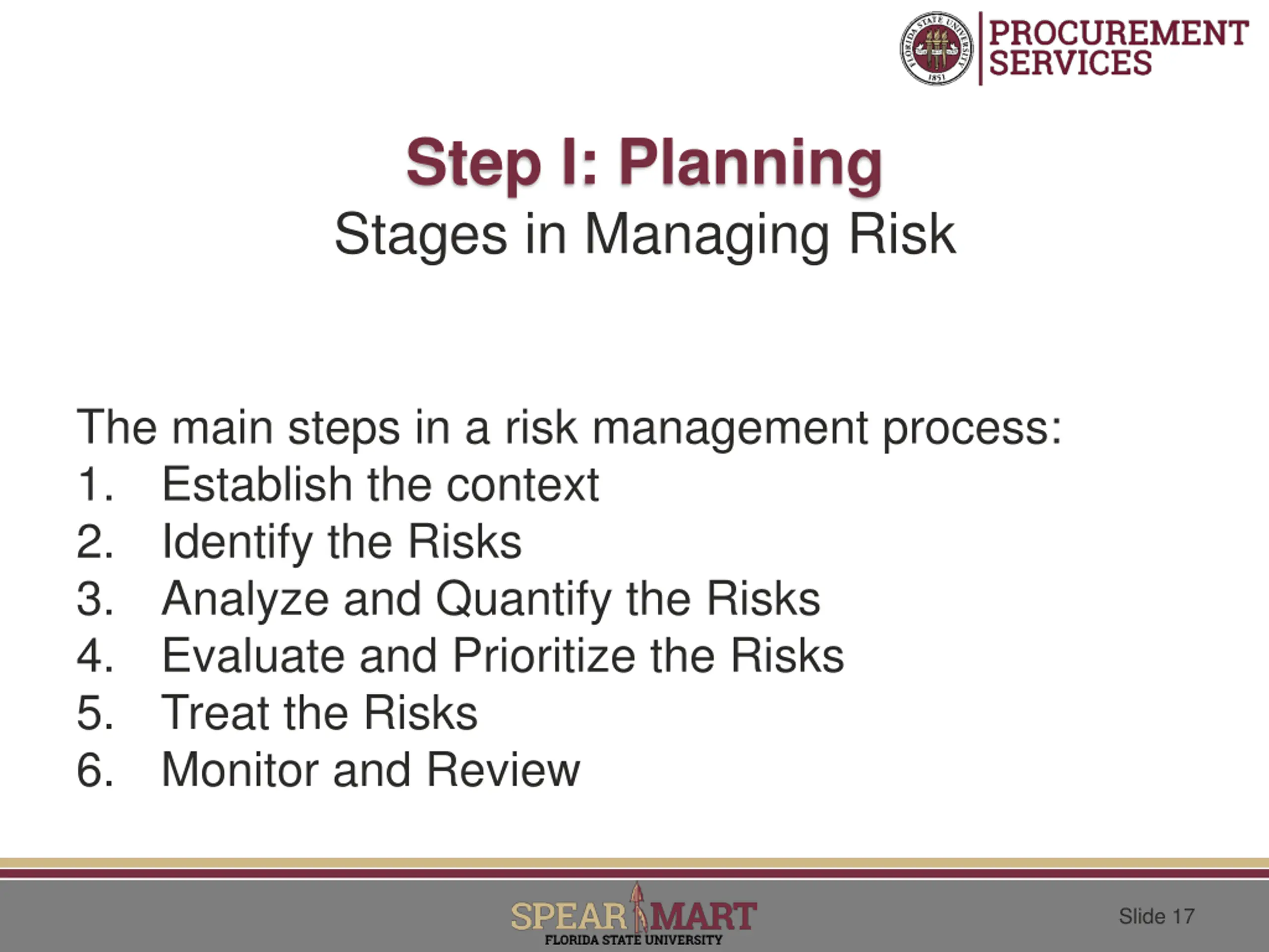 Step I: Planning Stages in Managing Risk The main steps in a risk management process: 1. Establish the context 2. Identify the Risks 3. Analyze and Quantify the Risks 4. Evaluate and Prioritize the Risks 5. Treat the Risks 6. Monitor and Review Slide 17