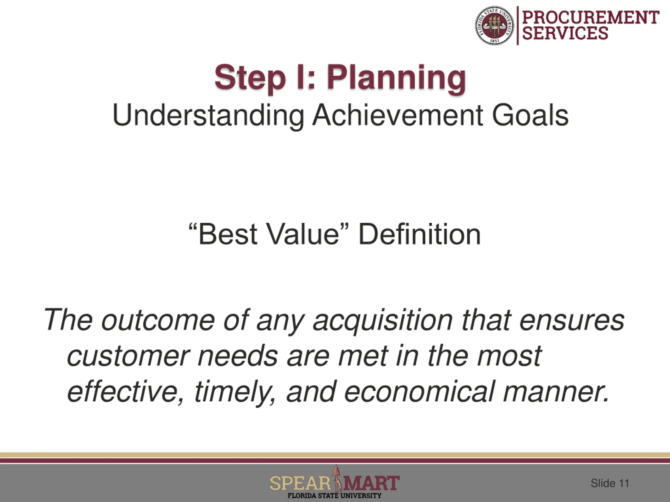 Step I: Planning Understanding Achievement Goals Best Value Definition The outcome of any acquisition that ensures customer needs are met in the most effective, timely, and economical manner. Slide 11