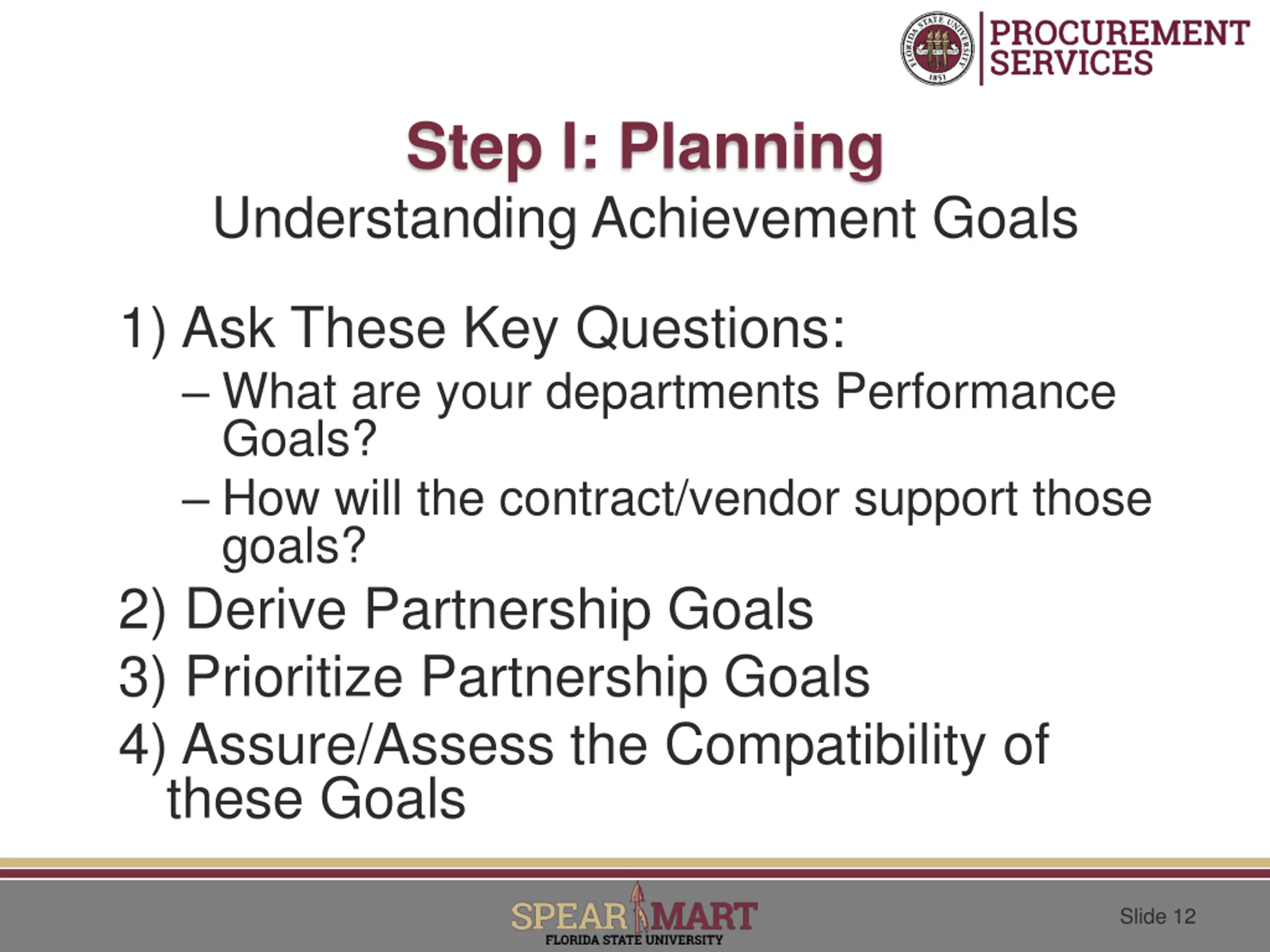 Step I: Planning Understanding Achievement Goals 1) Ask These Key Questions: What are your departments Performance Goals? How will the contract/vendor support those goals? 2) Derive Partnership Goals 3) Prioritize Partnership Goals 4) Assure/Assess the Compatibility of these Goals Slide 12