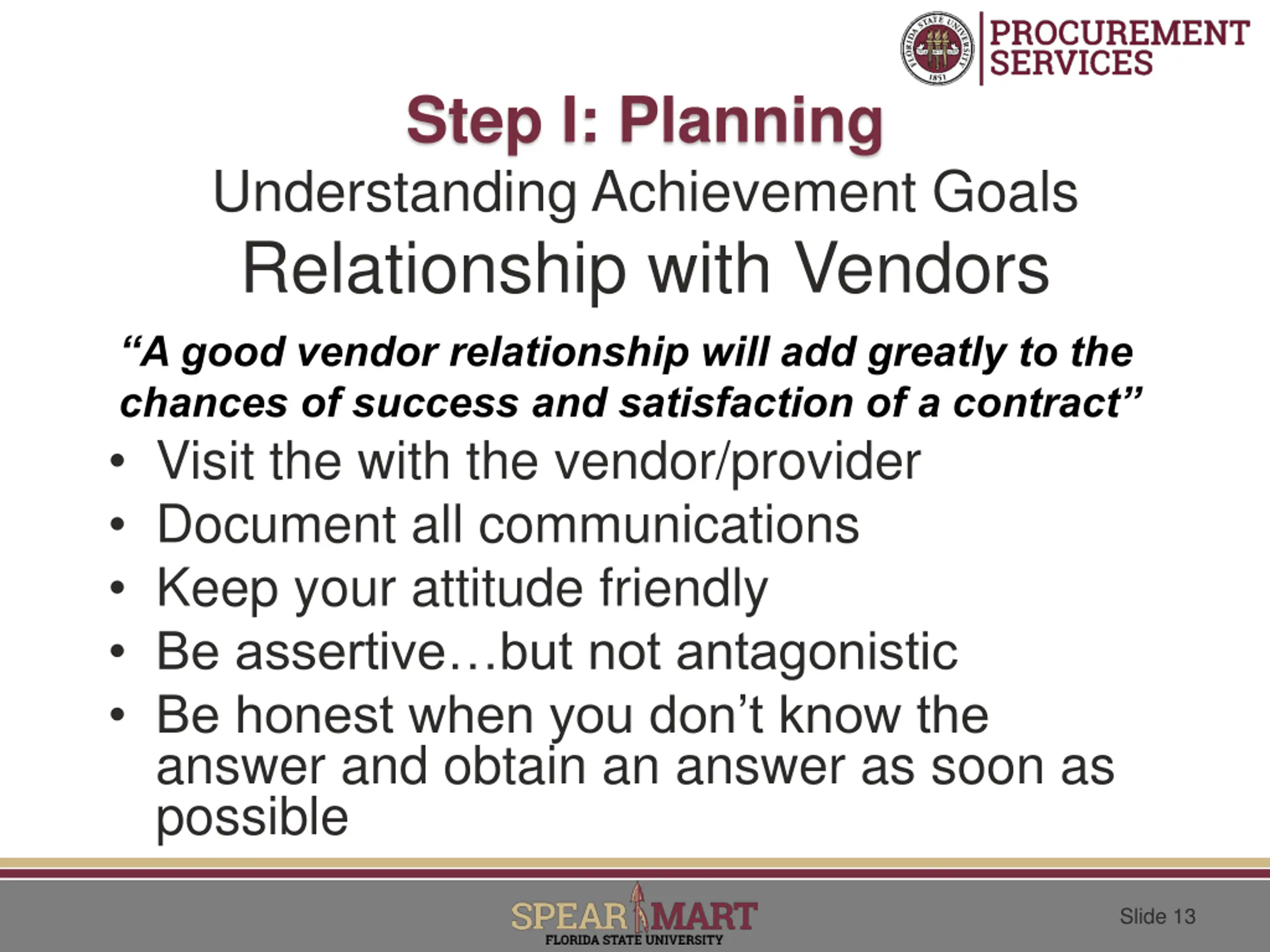 Step I: Planning Understanding Achievement Goals Relationship with Vendors A good vendor relationship will add greatly to the chances of success and satisfaction of a contract Visit the with the vendor/provider Document all communications Keep your attitude friendly Be assertive but not antagonistic Be honest when you don t know the answer and obtain an answer as soon as possible Slide 13