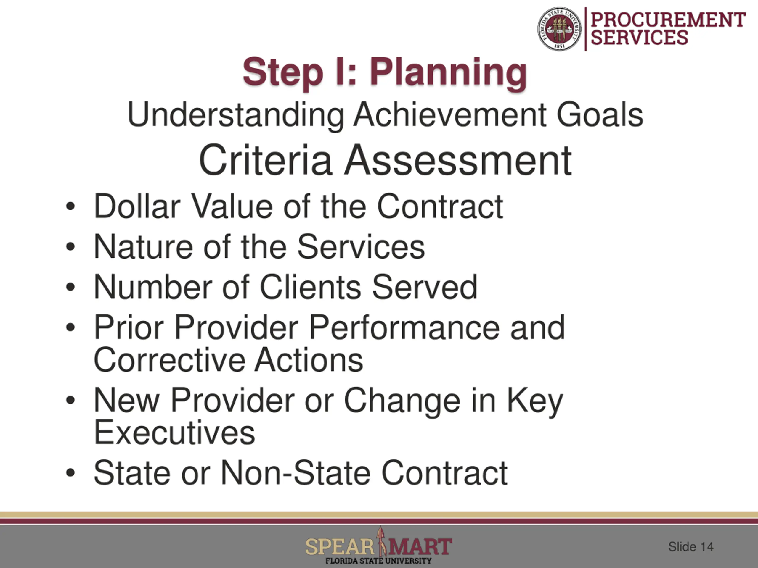 Step I: Planning Understanding Achievement Goals Criteria Assessment Dollar Value of the Contract Nature of the Services Number of Clients Served Prior Provider Performance and Corrective Actions New Provider or Change in Key Executives State or Non-State Contract Slide 14