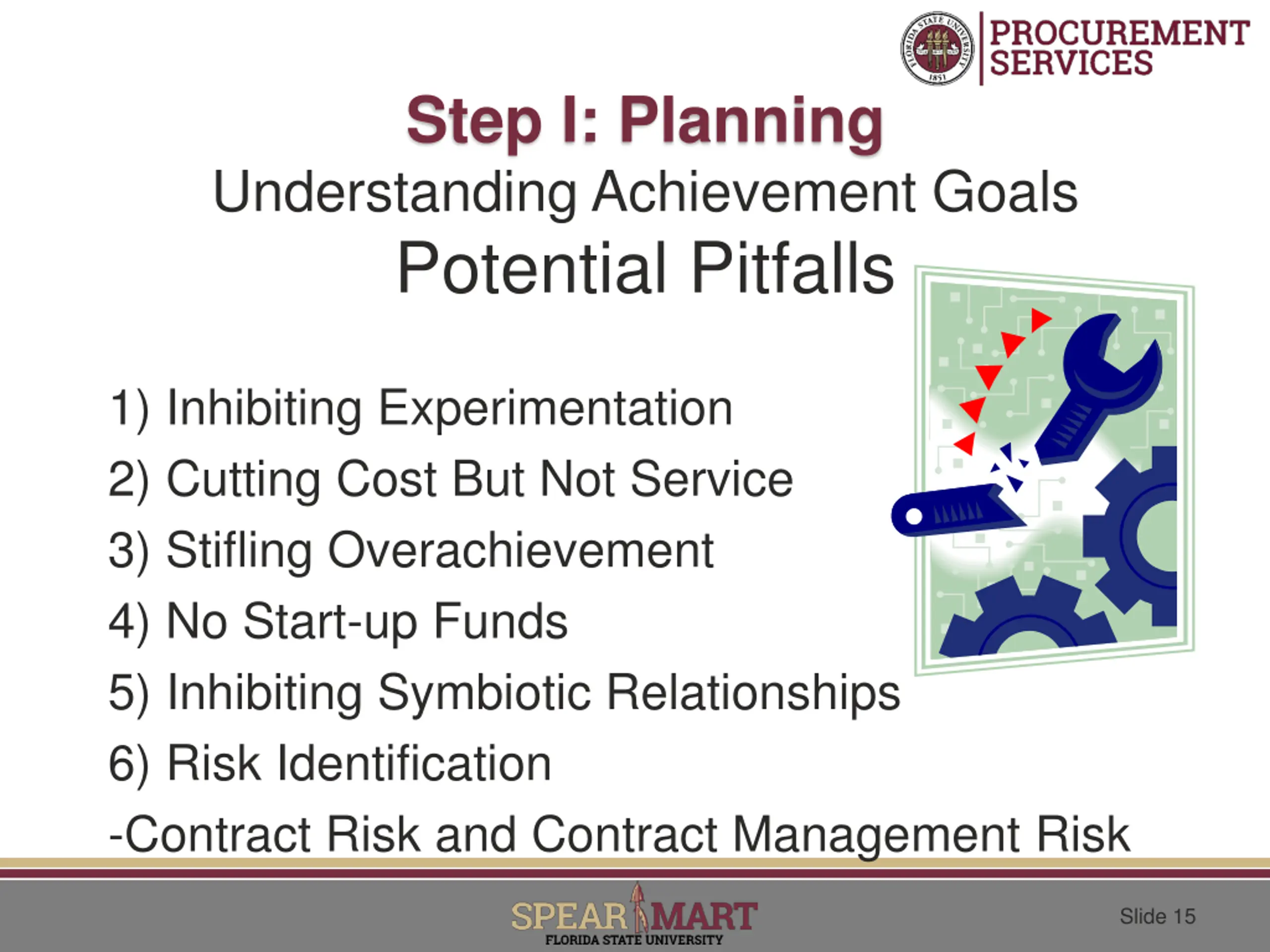 Step I: Planning Understanding Achievement Goals Potential Pitfalls 1) Inhibiting Experimentation 2) Cutting Cost But Not Service 3) Stifling Overachievement 4) No Start-up Funds 5) Inhibiting Symbiotic Relationships 6) Risk Identification -Contract Risk and Contract Management Risk Slide 15