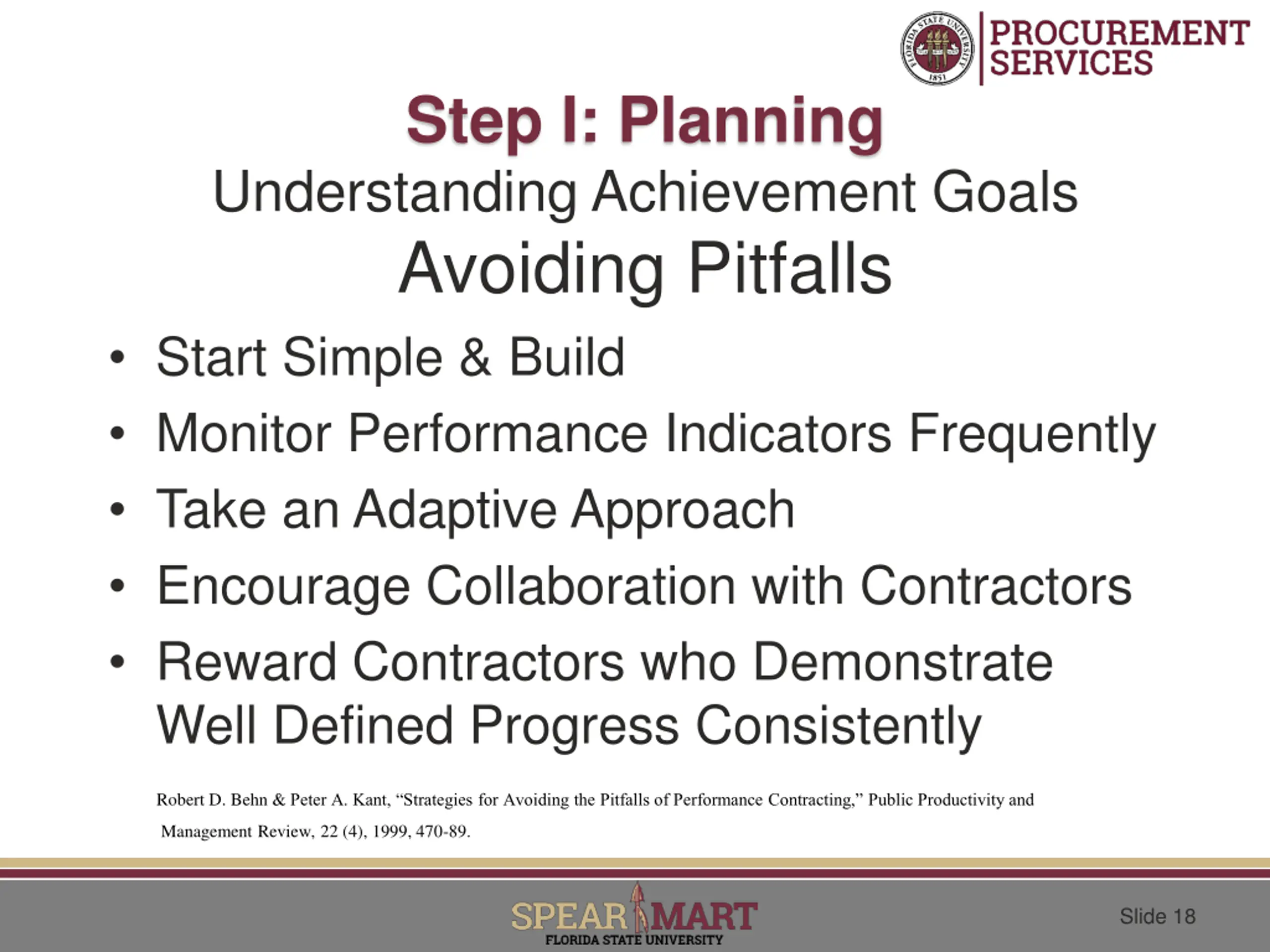 Step I: Planning Understanding Achievement Goals Avoiding Pitfalls Start Simple & Build Monitor Performance Indicators Frequently Take an Adaptive Approach Encourage Collaboration with Contractors Reward Contractors who Demonstrate Well Defined Progress Consistently Robert D. Behn & Peter A. Kant, Strategies for Avoiding the Pitfalls of Performance Contracting, Public Productivity and Management Review, 22 (4), 1999, 470-89. Slide 18