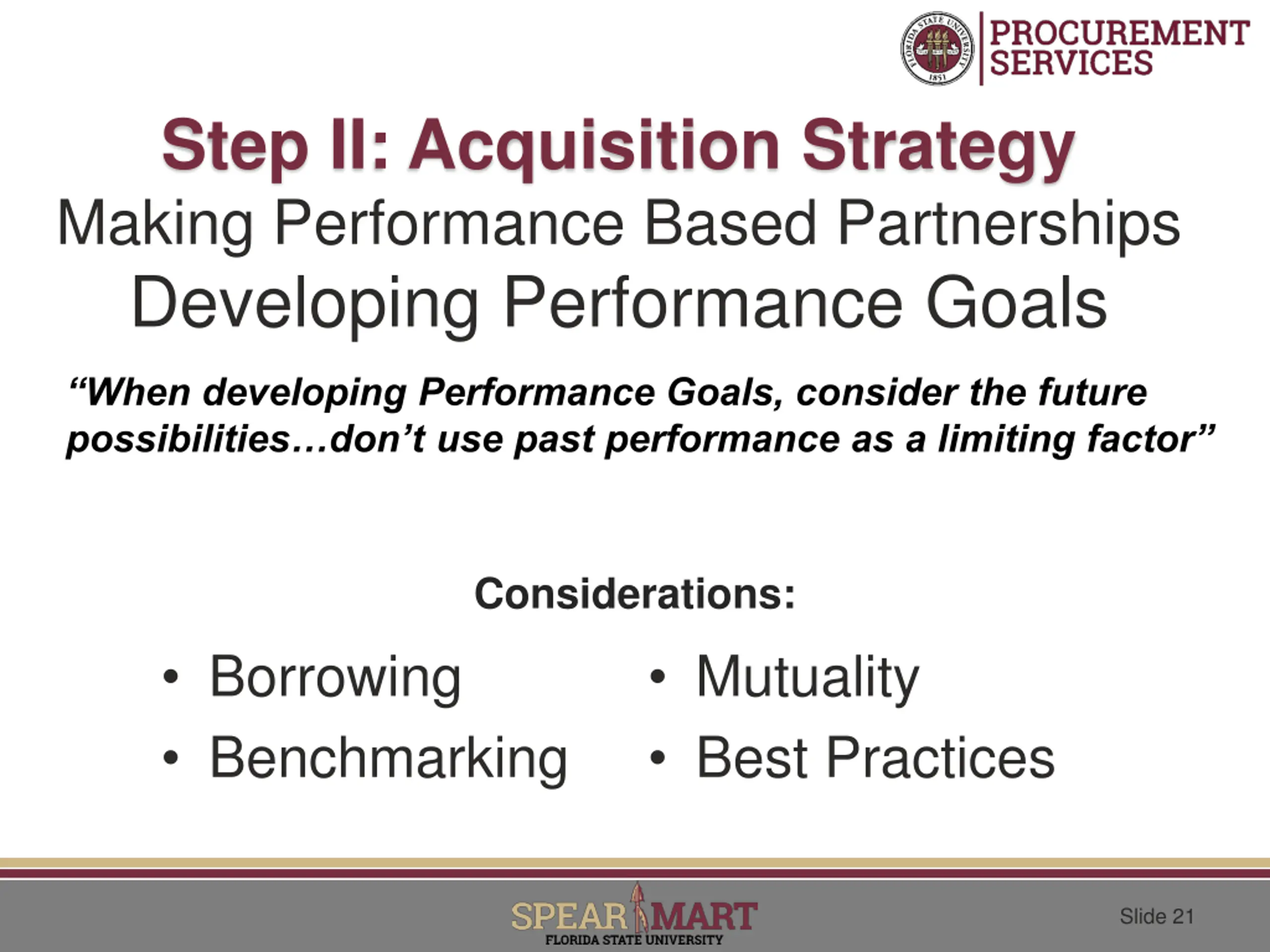 Step II: Acquisition Strategy Making Performance Based Partnerships Developing Performance Goals When developing Performance Goals, consider the future possibilities don t use past performance as a limiting factor Considerations: Borrowing Benchmarking Mutuality Best Practices Slide 21