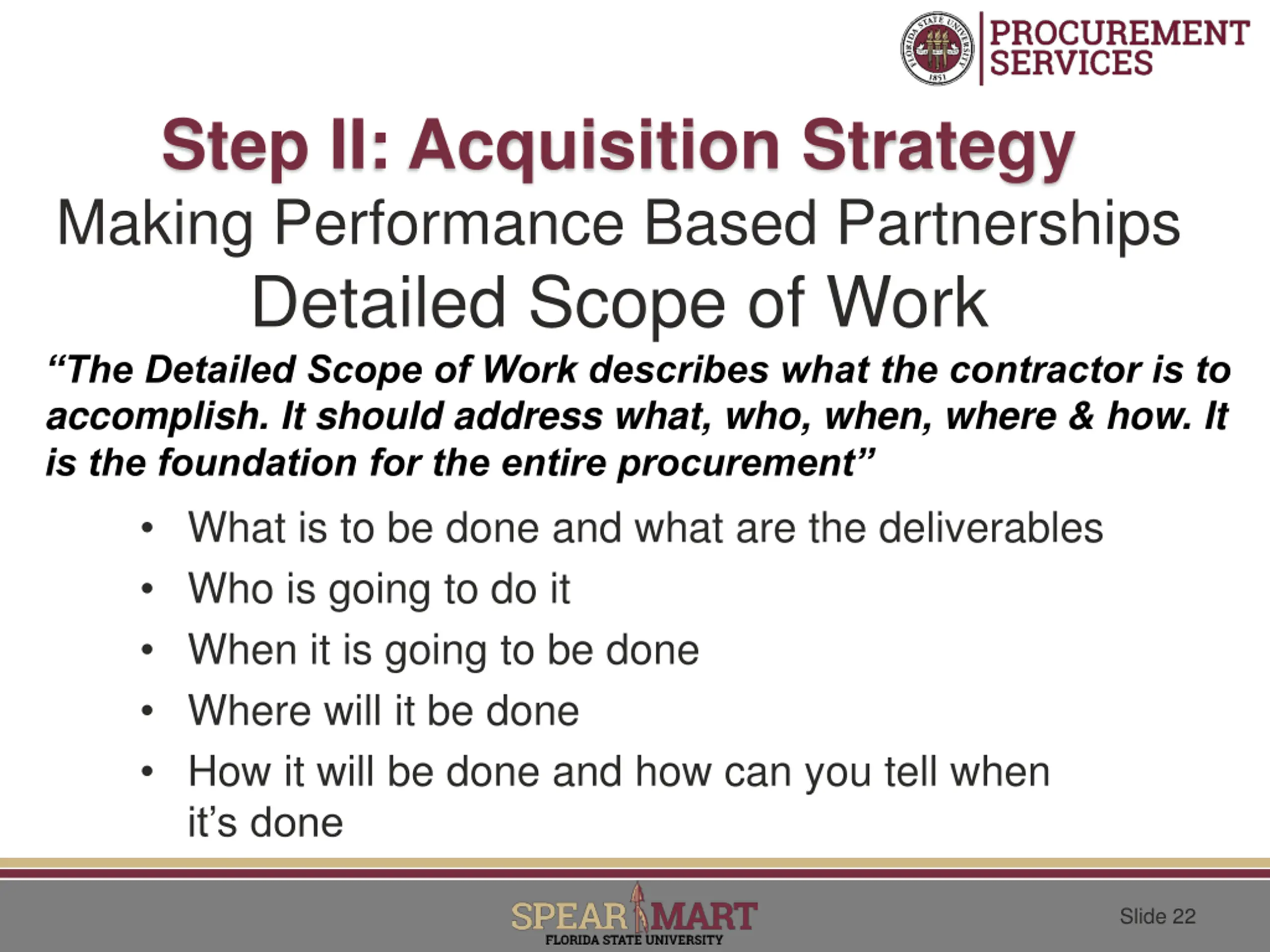 Step II: Acquisition Strategy Making Performance Based Partnerships Detailed Scope of Work The Detailed Scope of Work describes what the contractor is to accomplish. It should address what, who, when, where & how. It is the foundation for the entire procurement What is to be done and what are the deliverables Who is going to do it When it is going to be done Where will it be done How it will be done and how can you tell when it s done Slide 22