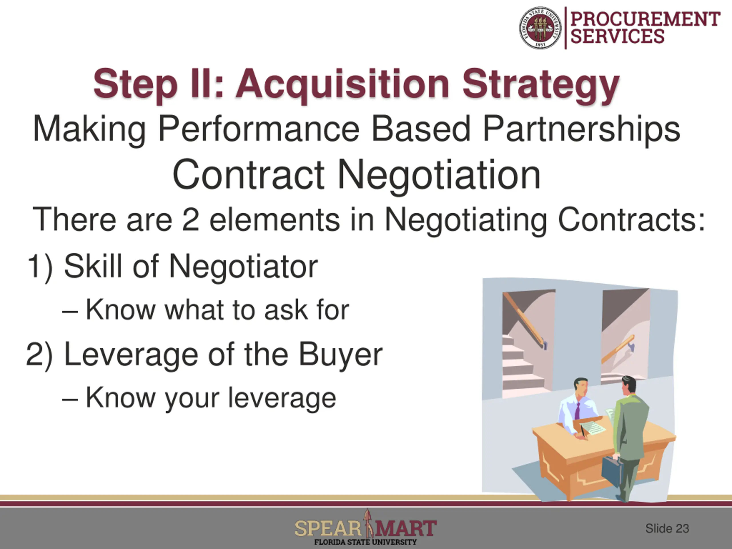 Step II: Acquisition Strategy Making Performance Based Partnerships Contract Negotiation There are 2 elements in Negotiating Contracts: 1) Skill of Negotiator Know what to ask for 2) Leverage of the Buyer Know your leverage Slide 23