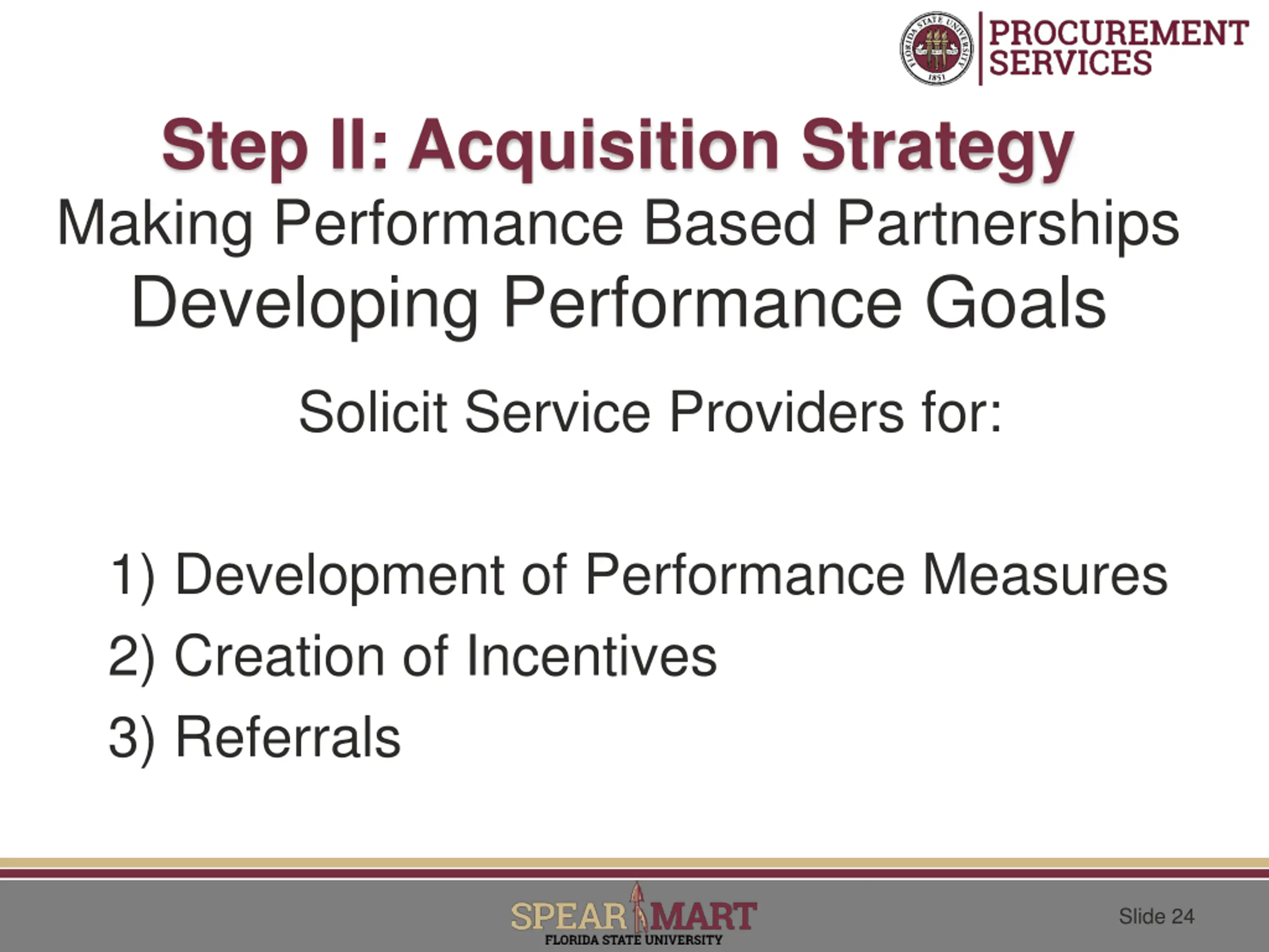 Step II: Acquisition Strategy Making Performance Based Partnerships Developing Performance Goals Solicit Service Providers for: 1) Development of Performance Measures 2) Creation of Incentives 3) Referrals Slide 24