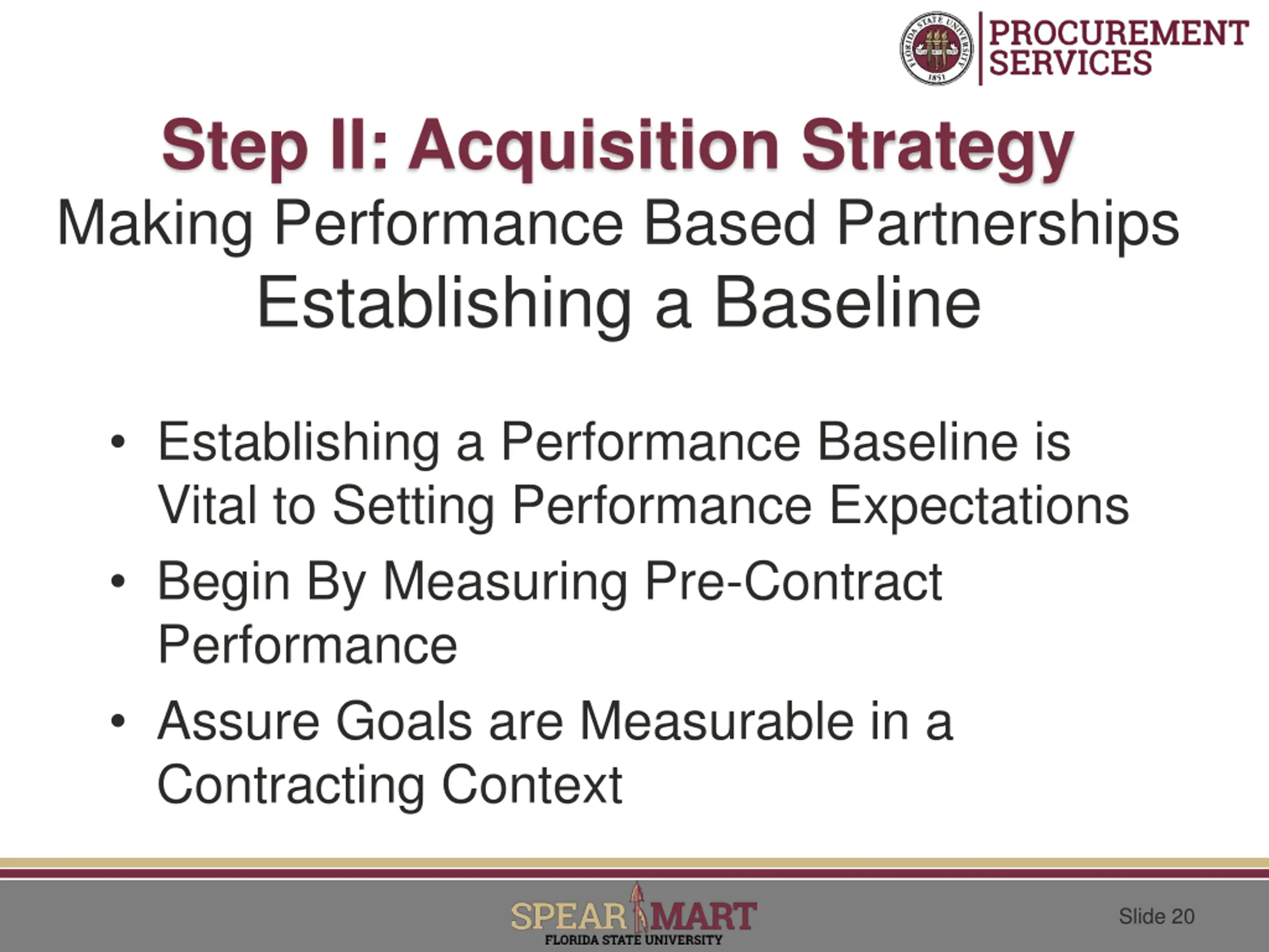 Step II: Acquisition Strategy Making Performance Based Partnerships Establishing a Baseline Establishing a Performance Baseline is Vital to Setting Performance Expectations Begin By Measuring Pre-Contract Performance Assure Goals are Measurable in a Contracting Context Slide 20