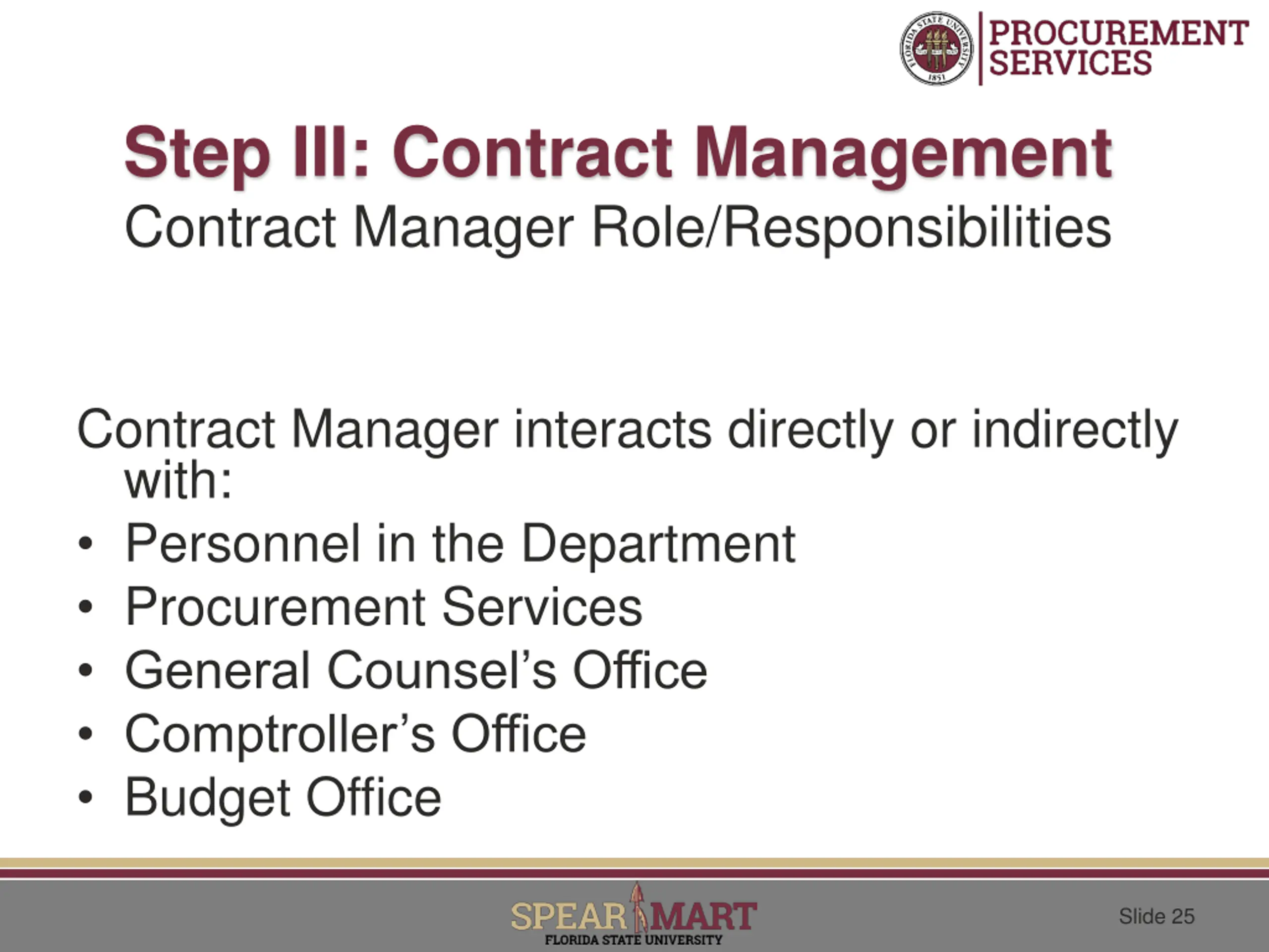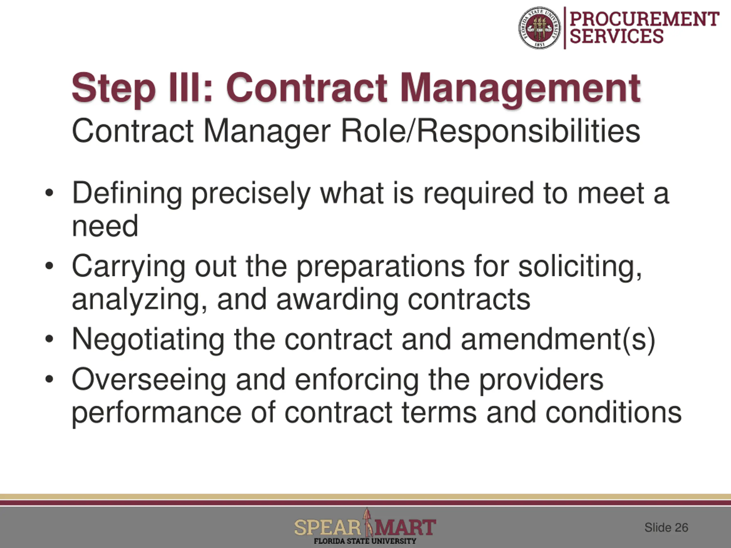 Step III: Contract Management Contract Manager Role/Responsibilities Contract Manager interacts directly or indirectly with: Personnel in the Department Procurement Services General Counsel s Office Comptroller s Office Budget Office Slide 25