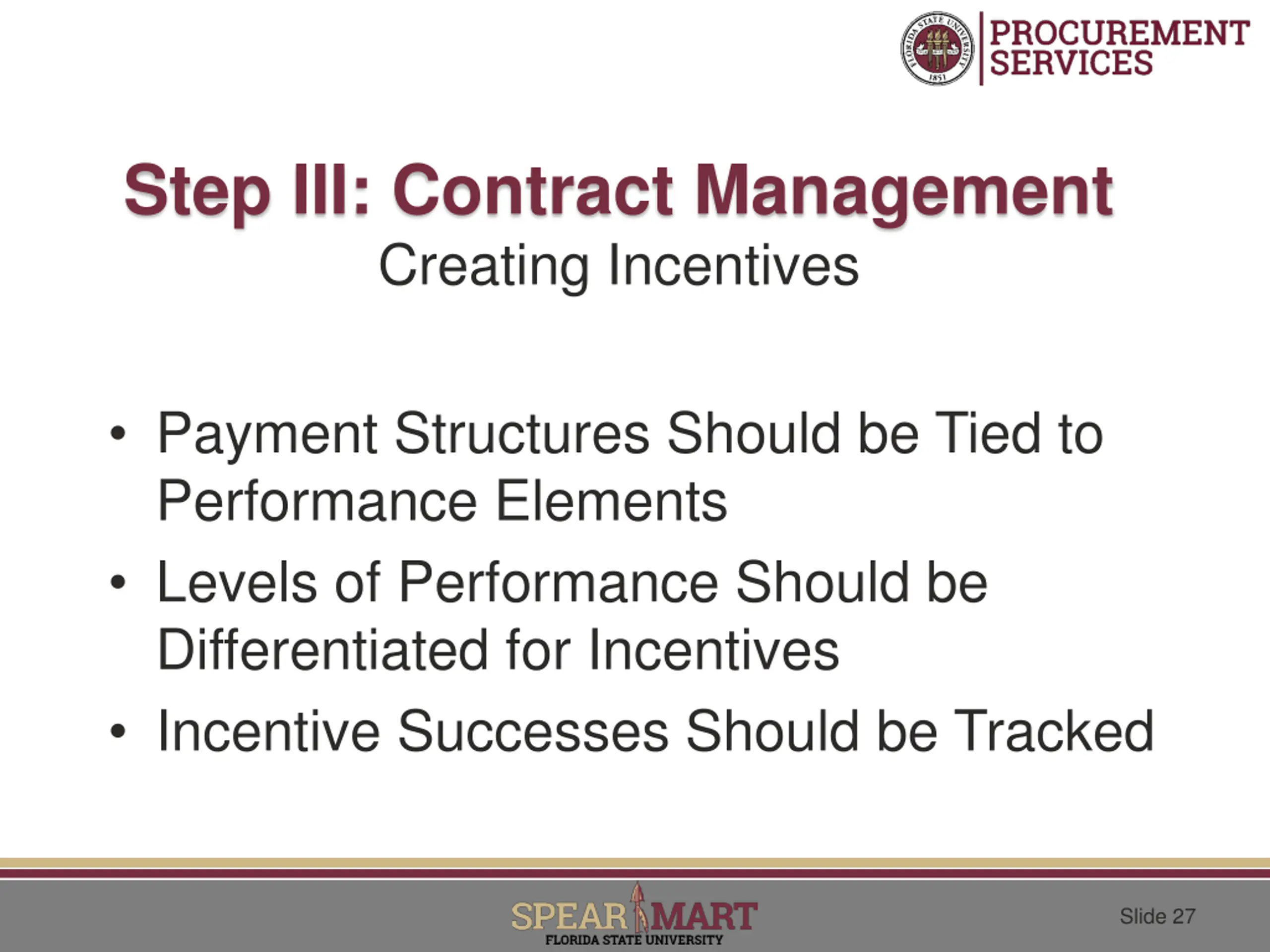 Step III: Contract Management Creating Incentives Payment Structures Should be Tied to Performance Elements Levels of Performance Should be Differentiated for Incentives Incentive Successes Should be Tracked Slide 27