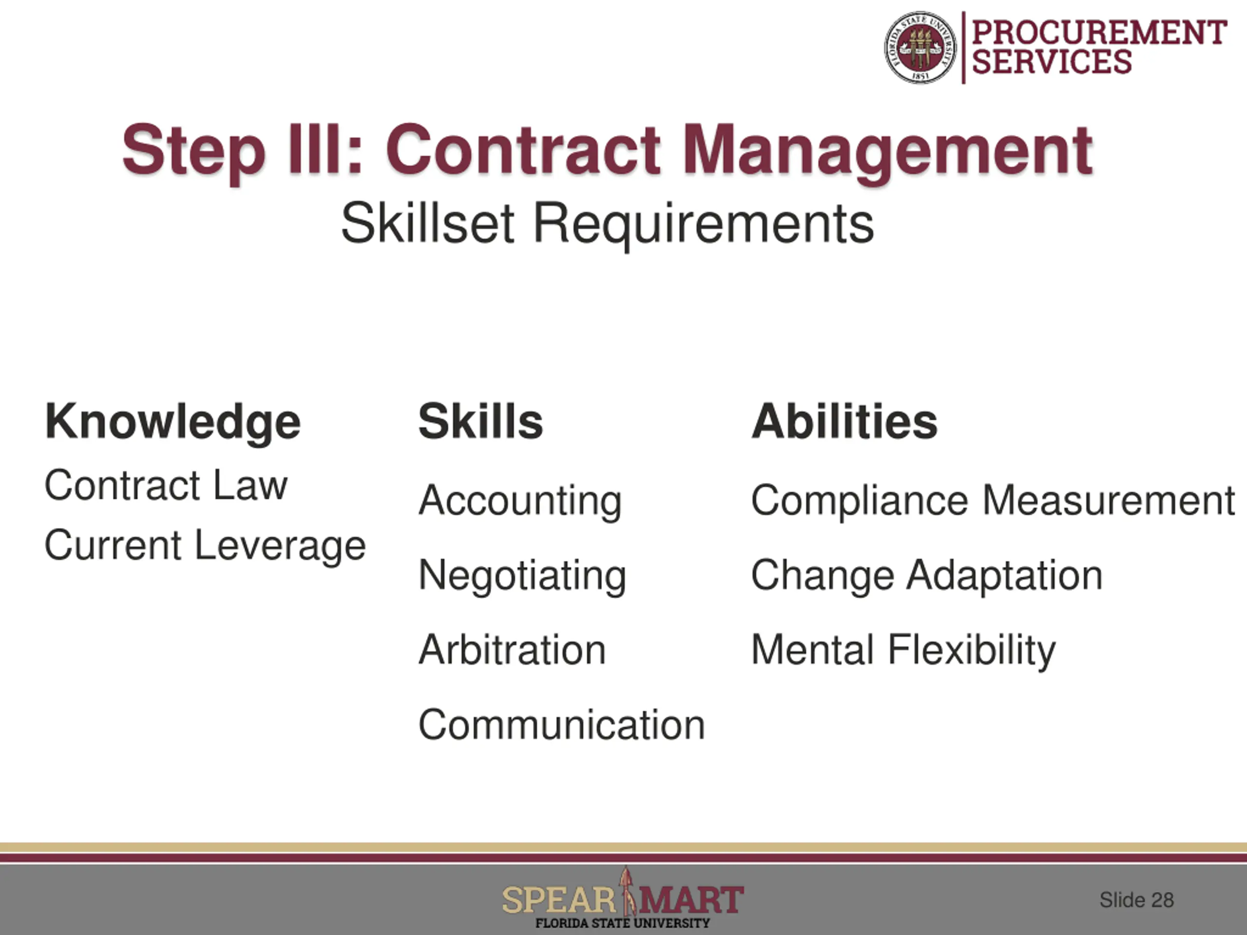Step III: Contract Management Skillset Requirements Knowledge Contract Law Current Leverage Skills Abilities Accounting Compliance Measurement Negotiating Change Adaptation Arbitration Mental Flexibility Communication Slide 28