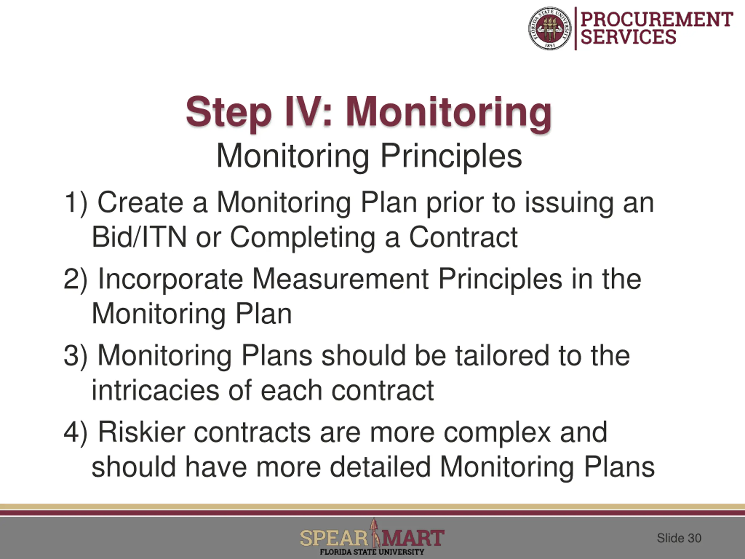 Step IV: Monitoring Monitoring Principles 1) Create a Monitoring Plan prior to issuing an Bid/ITN or Completing a Contract 2) Incorporate Measurement Principles in the Monitoring Plan 3) Monitoring Plans should be tailored to the intricacies of each contract 4) Riskier contracts are more complex and should have more detailed Monitoring Plans Slide 30