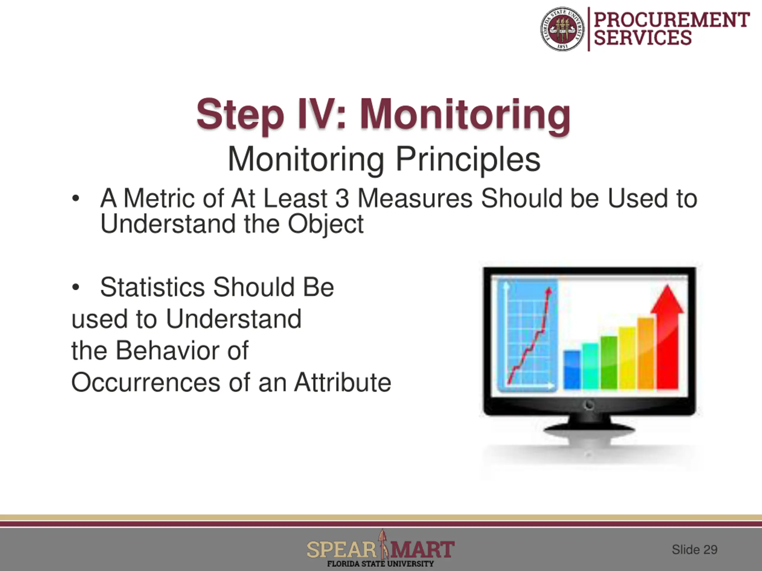 Step IV: Monitoring Monitoring Principles A Metric of At Least 3 Measures Should be Used to Understand the Object Statistics Should Be used to Understand the Behavior of Occurrences of an Attribute Slide 29