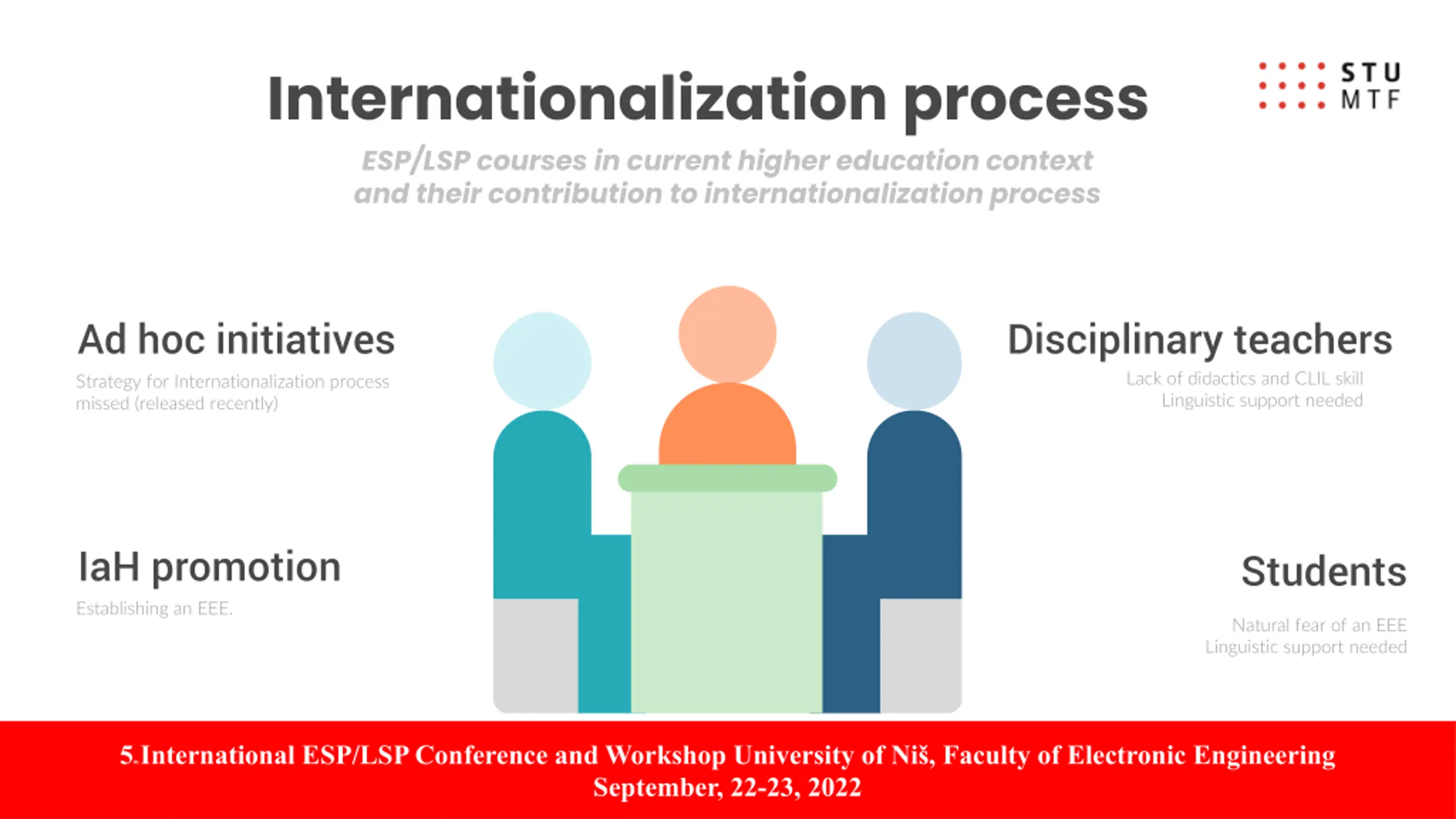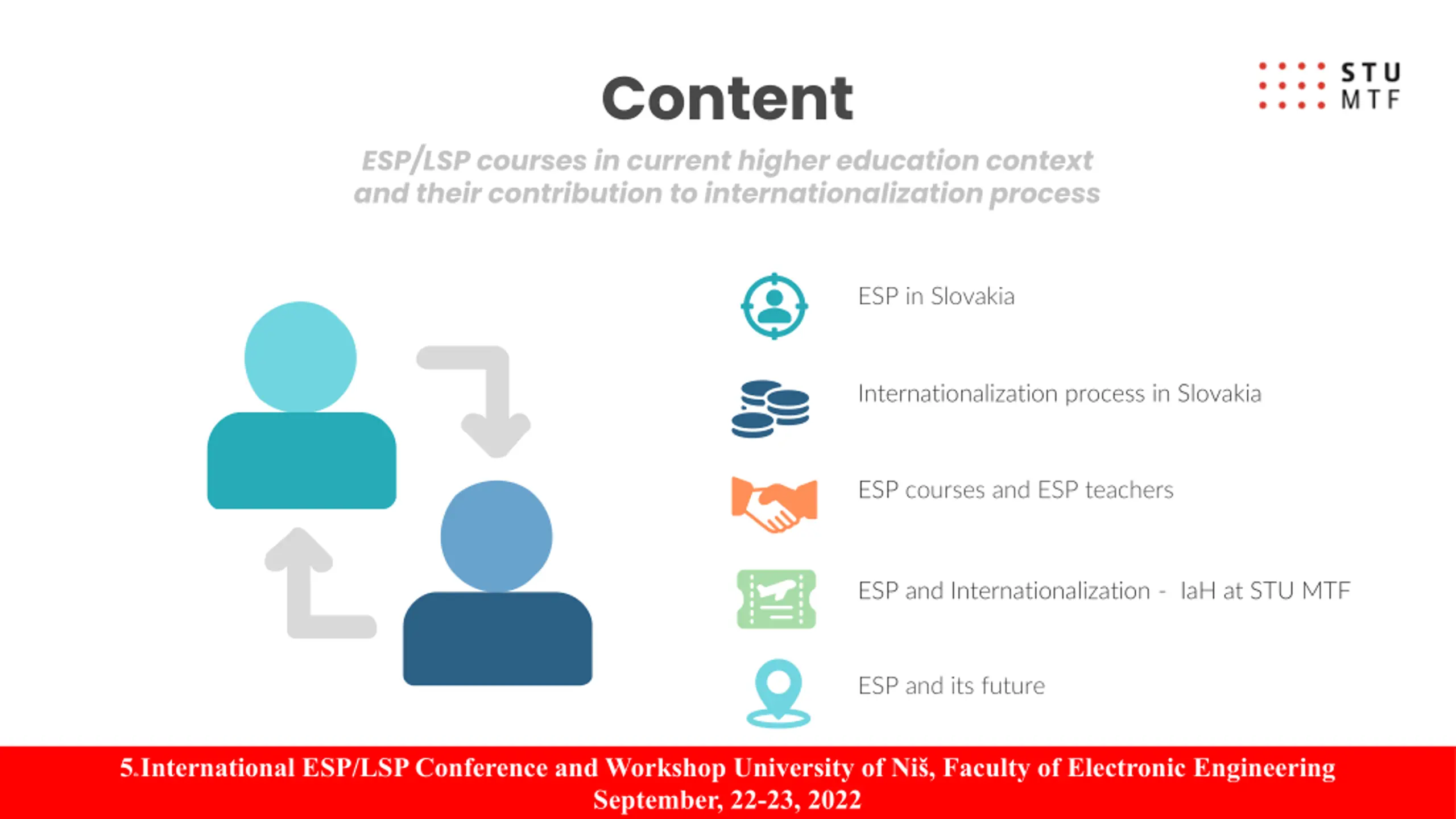 Content ESP/LSP courses in current higher education context and their contribution to internationalization process ESP in Slovakia Internationalization process in Slovakia ESP courses and ESP teachers ESP and Internationalization - IaH at STU MTF ESP and its future 5th International ESP/LSP Conference and Workshop University of Nis , Faculty of Electronic Engineering September, 22-23, 2022