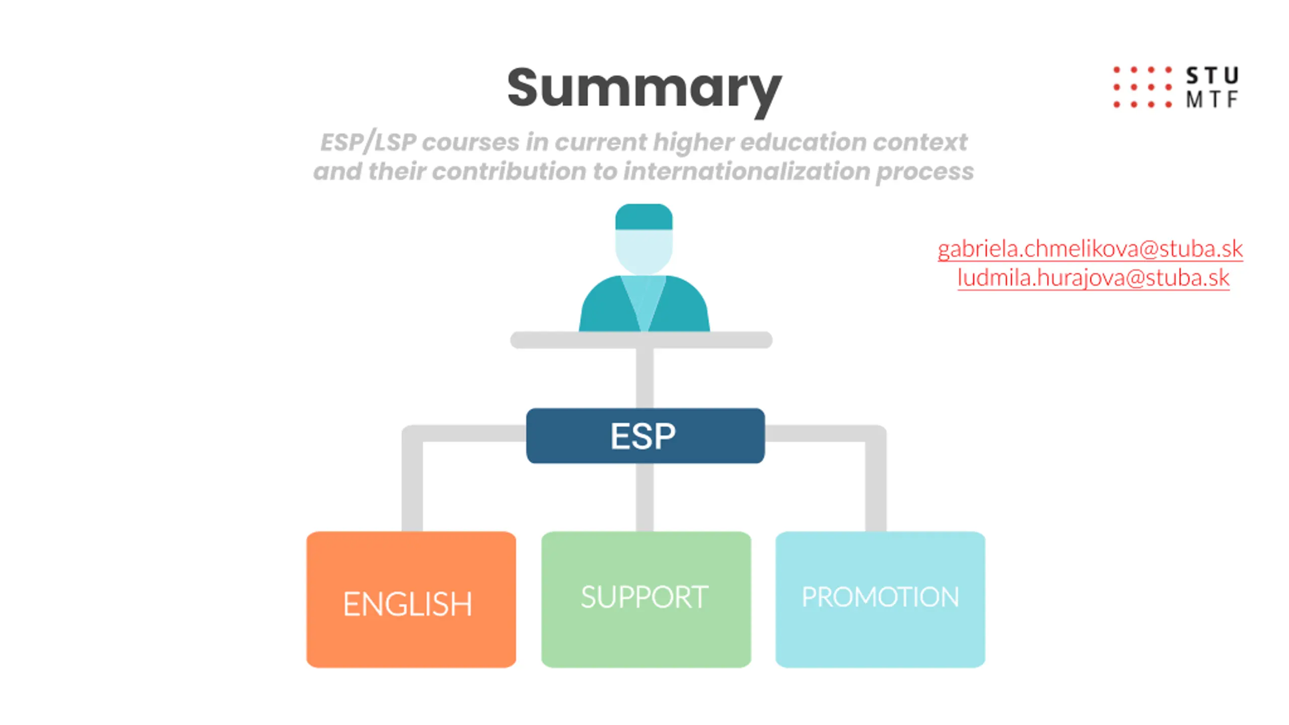 Summary ESP/LSP courses in current higher education context and their contribution to internationalization process . gabriela.chmelikova@stuba.sk ludmila.hurajova@stuba.sk ESP SUPPORT SUPPORT PROMOTION PROMOTION ENGLISH ENGLISH