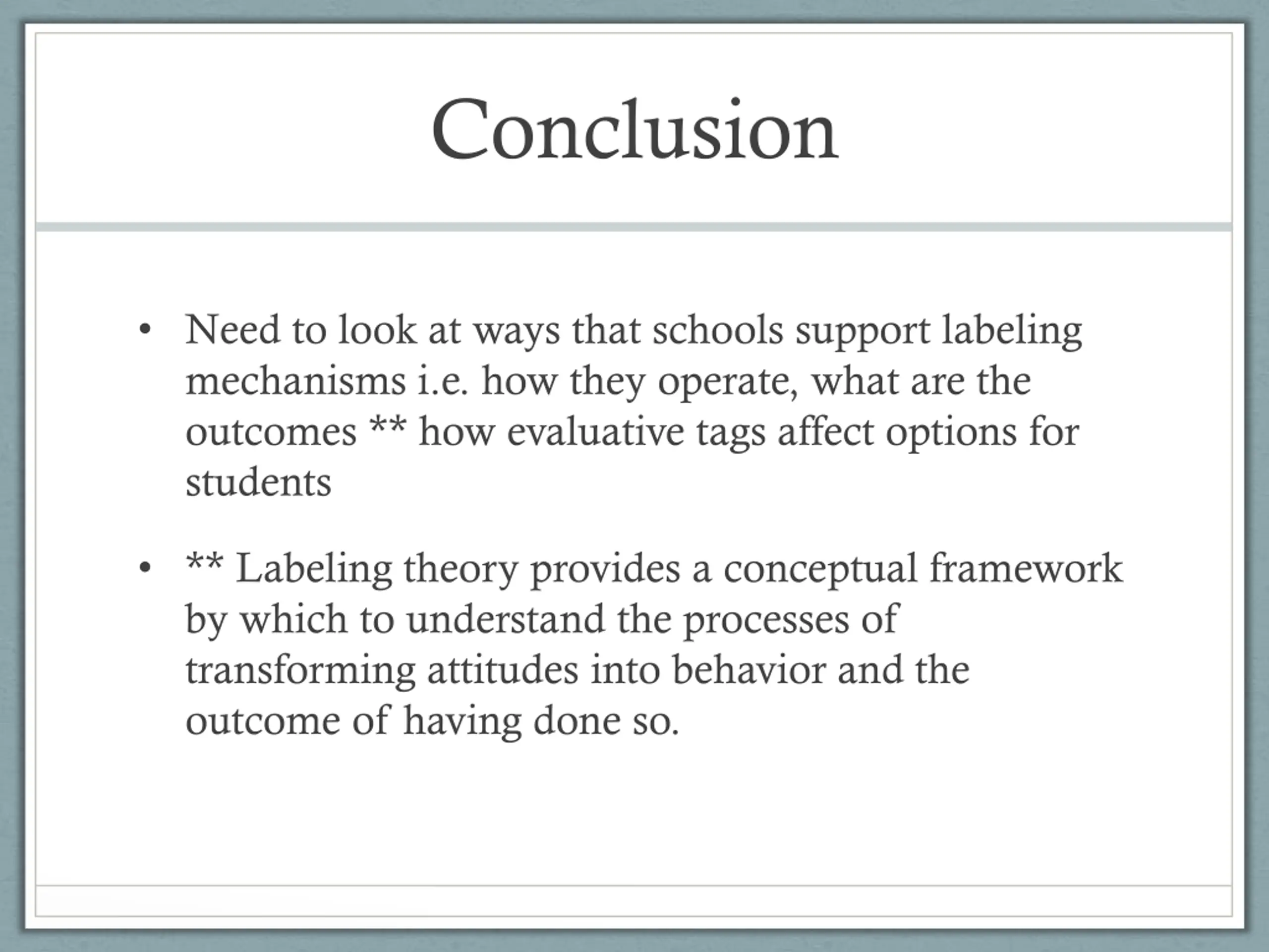 Conclusion Need to look at ways that schools support labeling mechanisms i.e. how they operate, what are the outcomes ** how evaluative tags affect options for students ** Labeling theory provides a conceptual framework by which to understand the processes of transforming attitudes into behavior and the outcome of having done so.
