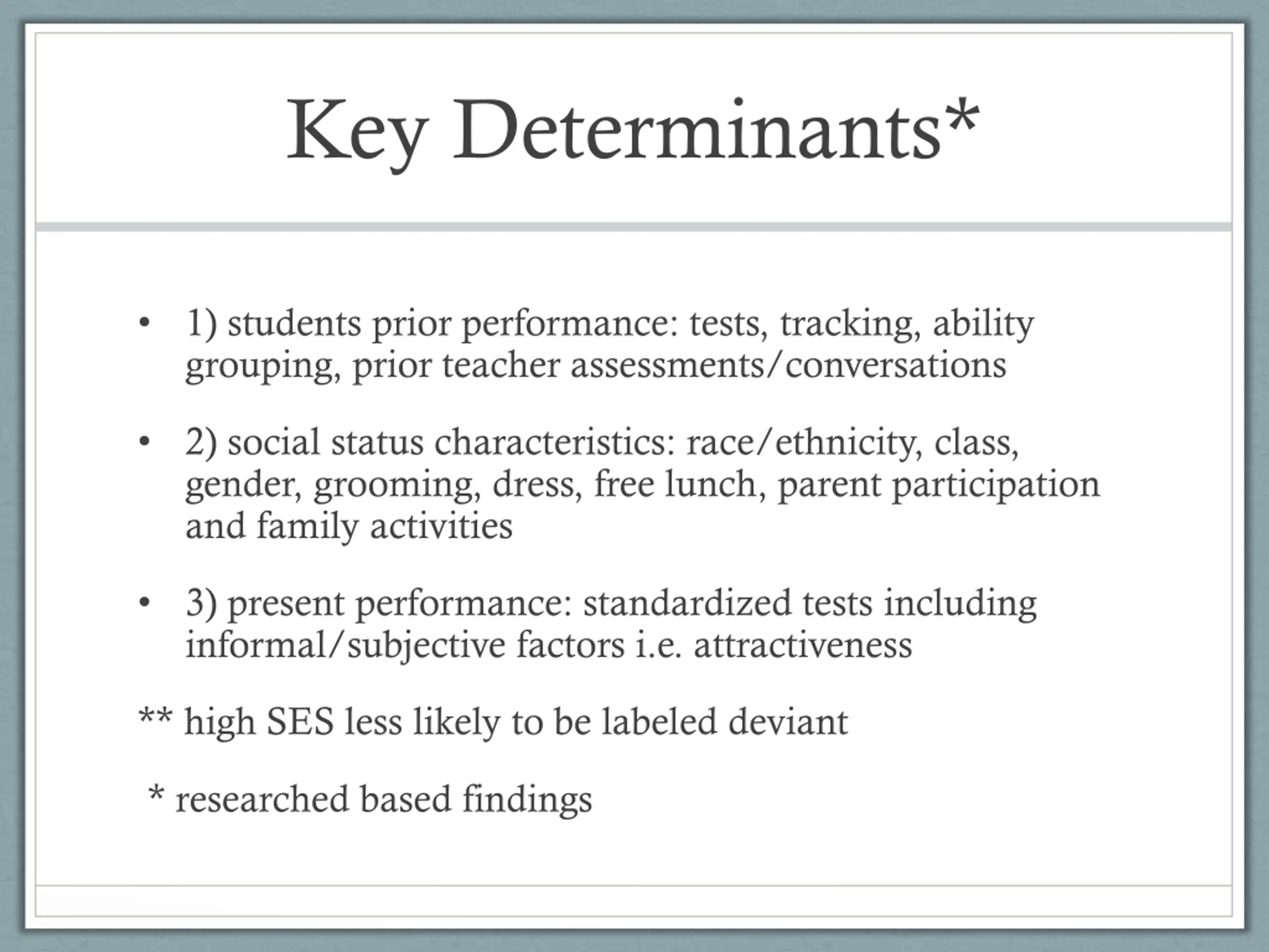 Key Determinants* 1) students prior performance: tests, tracking, ability grouping, prior teacher assessments/conversations 2) social status characteristics: race/ethnicity, class, gender, grooming, dress, free lunch, parent participation and family activities 3) present performance: standardized tests including informal/subjective factors i.e. attractiveness ** high SES less likely to be labeled deviant * researched based findings