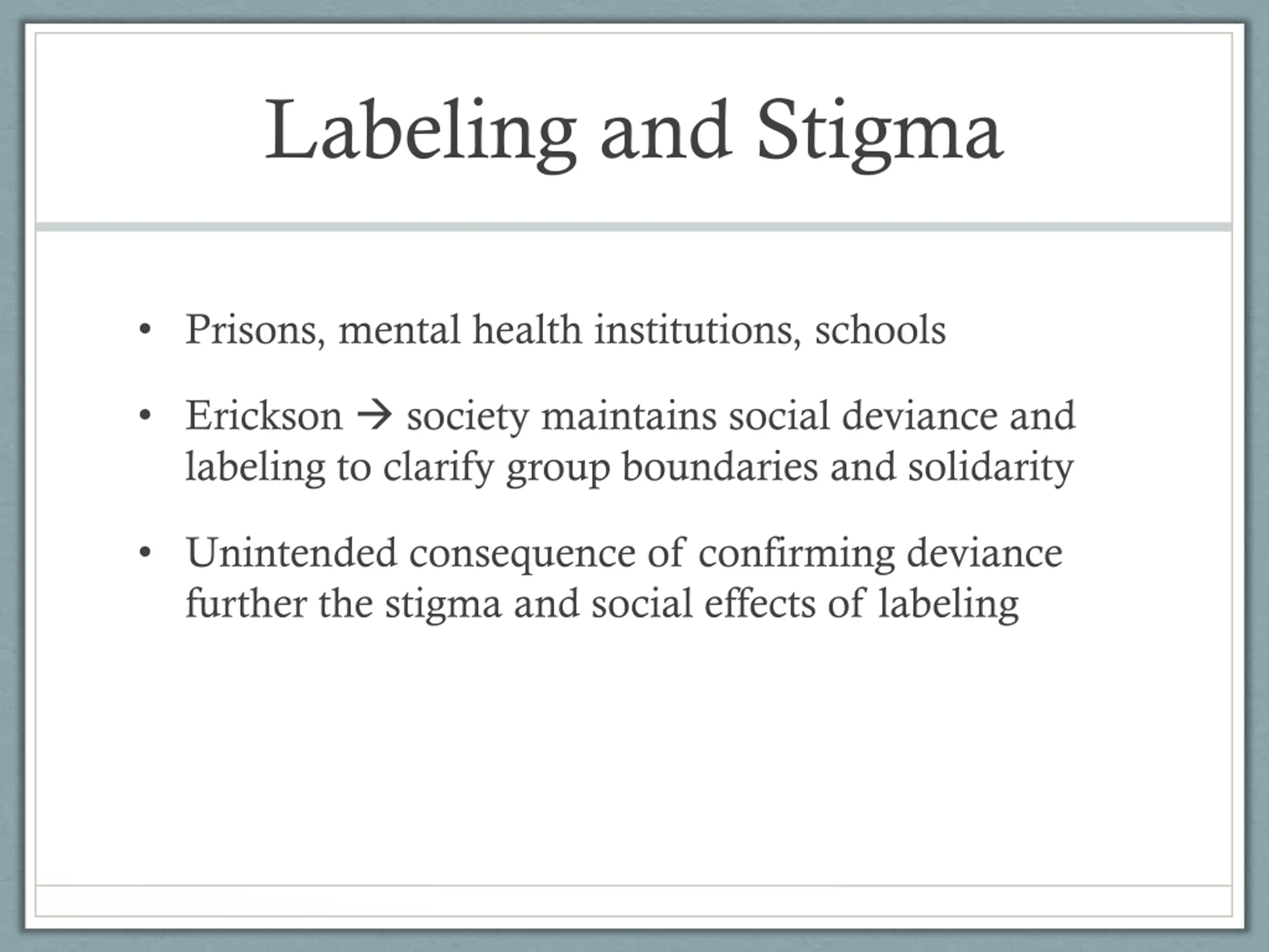 Labeling and Stigma Prisons, mental health institutions, schools Erickson society maintains social deviance and labeling to clarify group boundaries and solidarity Unintended consequence of confirming deviance further the stigma and social effects of labeling