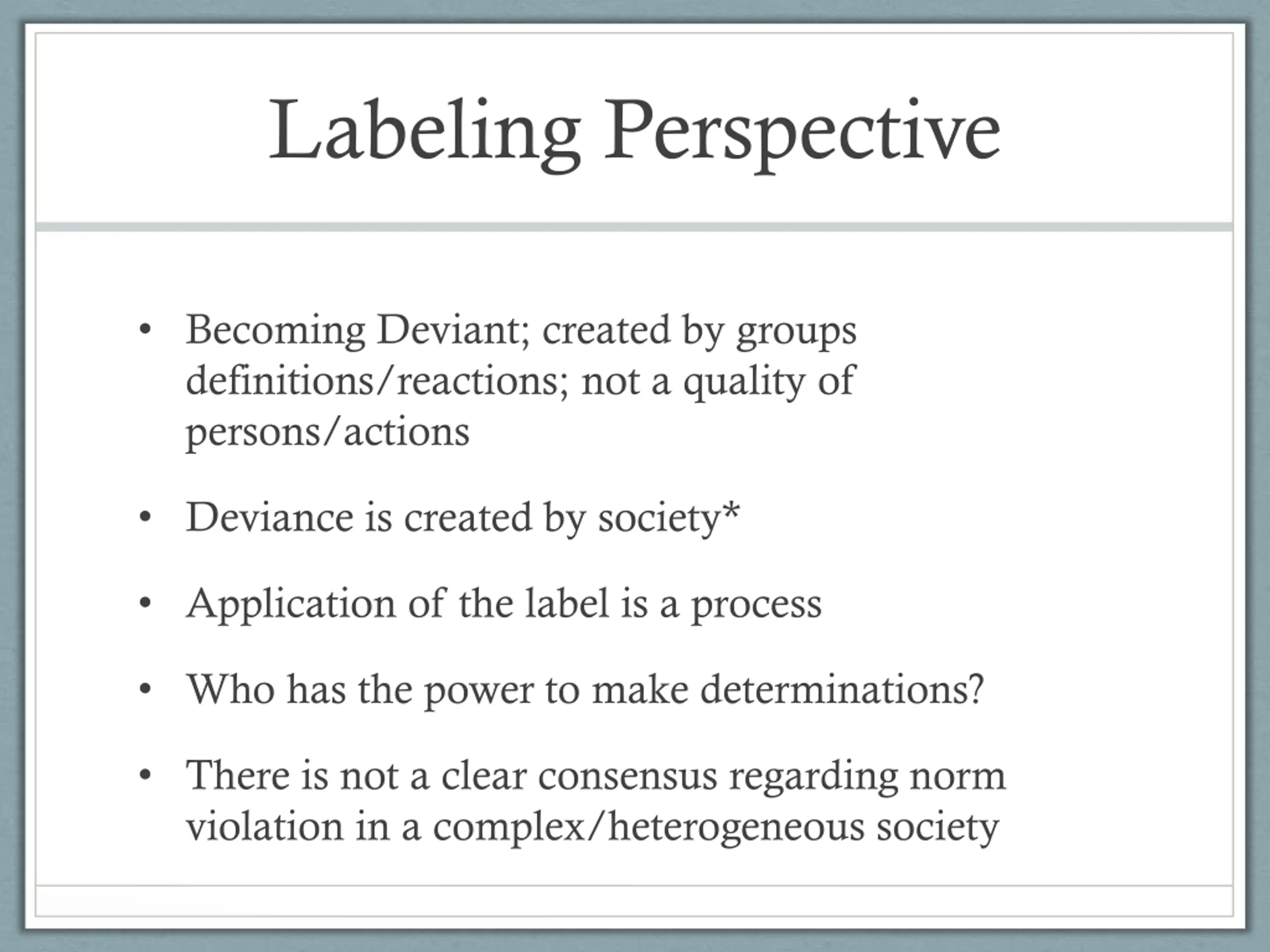 Labeling Perspective Becoming Deviant; created by groups definitions/reactions; not a quality of persons/actions Deviance is created by society* Application of the label is a process Who has the power to make determinations? There is not a clear consensus regarding norm violation in a complex/heterogeneous society
