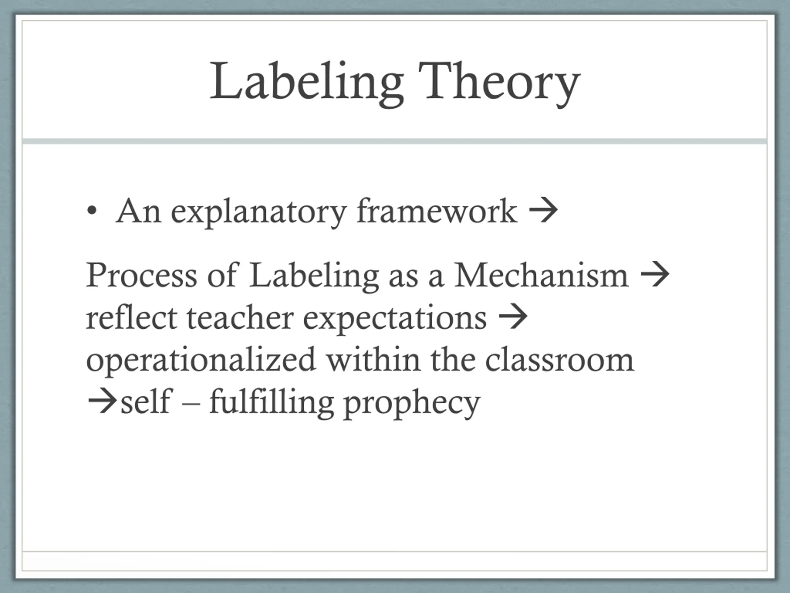 Labeling Theory An explanatory framework Process of Labeling as a Mechanism reflect teacher expectations operationalized within the classroom self fulfilling prophecy